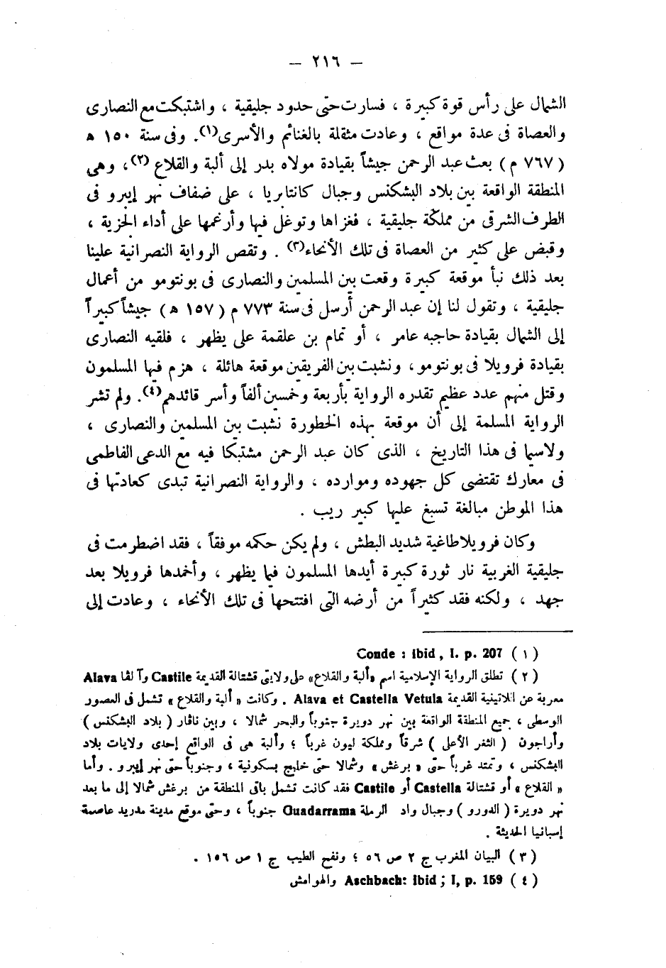 الشمال على رأس قوة كبيرة، فسارت حتى حدود جليقية، واشتبكت مع النصارى والعصاة في عدة مواقع، وعادت مثقلة بالغنائم والأسرى (¬1). وفي سنة 150هـ (767 م) بعث عبد الرحمن جيشاً بقيادة مولاه بدر إلى ألبة والقلاع (¬2)، وهي المنطقة الواقعة بين بلاد البشكنس وجبال كانتابريا، على ضفاف نهر إيبرو في الطرف الشرقي من مملكة جليقية، فغزاها وتوغل فيها وأرغمها على أداء الجزية، وقبض على كثير من العصاة في تلك الأنحاء (¬3). وتقص الرواية النصرانية علينا بعد ذلك نبأ موقعة كبيرة وقعت بين المسلمين والنصارى في بونتومو من أعمال جليقية، وتقول لنا إن عبد الرحمن أرسل في سنة 773 م (157هـ) جيشاً كبيراً إلى الشمال بقيادة حاجبه عامر، أو تمام بن علقمة على يظهر، فلقيه النصارى بقيادة فرويلا في بونتومو، ونشبت بين الفريقين موقعة هائلة، هزم فيها المسلمون وقتل منهم عدد عظيم تقدره الرواية بأربعة وخمسين ألفاً وأسر قائدهم (¬4). ولم تشر الرواية المسلمة إلى أن موقعة بهذه الخطورة نشبت بين المسلمين والنصارى، ولاسيما في هذا التاريخ، الذي كان عبد الرحمن مشتبكا فيه مع الدعى الفاطمي في معارك تقتضى كل جهوده وموارده، والرواية النصرانية تبدي كعادتها في هذا الموطن مبالغة تسبغ عليها كبير ريب.
