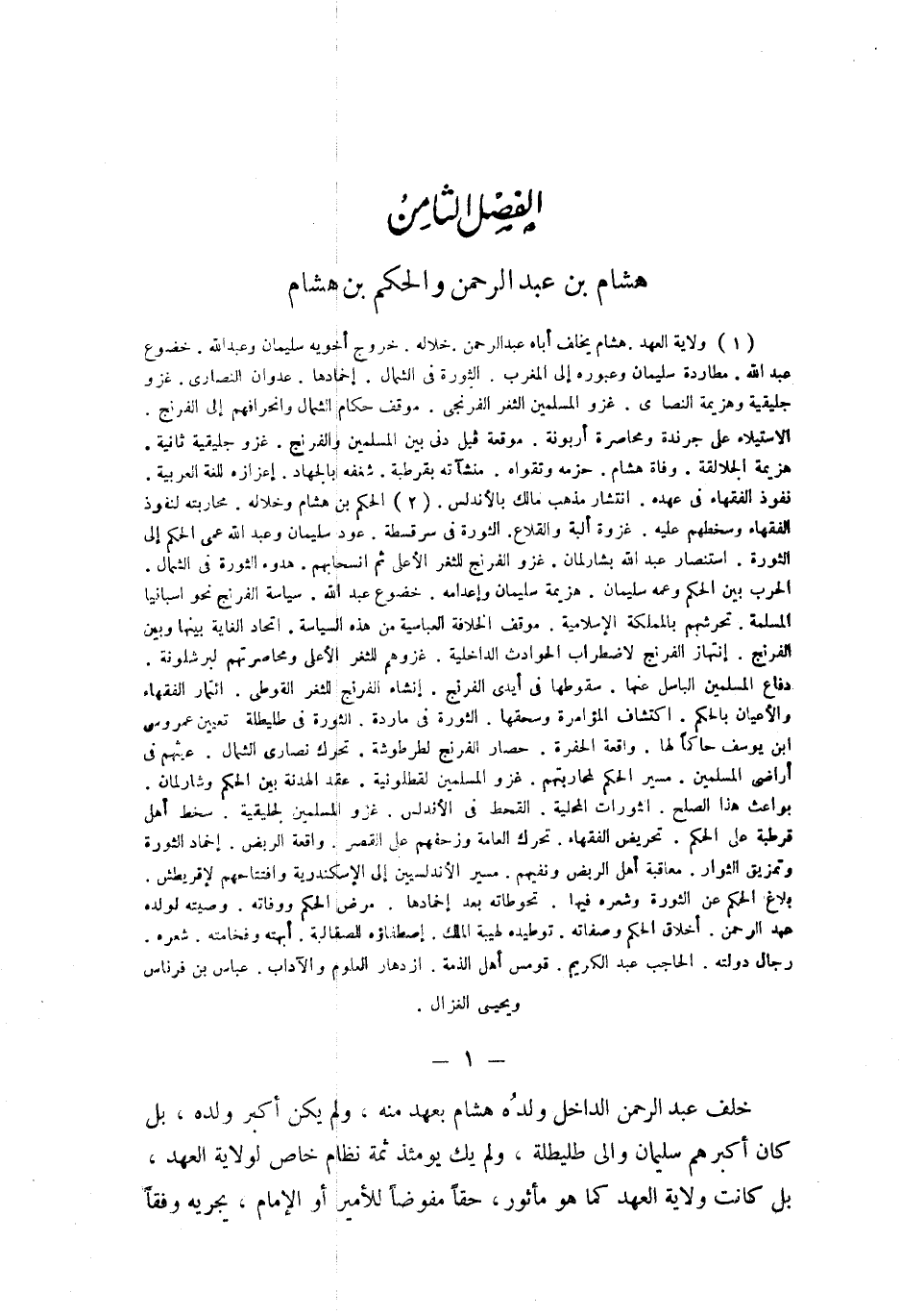 (1) ولاية العهد. هشام يخلف أباه عبد الرحمن. خلاله. خروج أخويه سليمان وعبد الله. خضوع عبد الله. مطاردة سليمان وعبوره إلى المغرب. الثورة في الشمال. إخمادها. عدوان النصارى. غزو جليقية وهزيمة النصارى. غزو المسلمين الثغر الفرنجي. موقف حكام الشمال وانحرافهم إلى الفرنج. الاستيلاء على جرندة ومحاصرة أربونة. موقعة فيل دني بين المسلمين والفرنج. غزو جليقية ثانية. هزيمة الجلالقة. وفاة هشام. حزمه وتقواه. منشآته بقرطبة. شغفه بالجهاد. إعزازه للغة العربية. نفوذ الفقهاء في عهده. انتشار مذهب مالك بالأندلس. (2) الحكم بن هشام وخلاله. محاربته لنفوذ الفقهاء وسخطهم عليه. غزوة ألبة والقلاع. الثورة في سرقسطة. عود سليمان وعبد الله عمى الحكم إلى الثورة. استنصار عبد الله بشارلمان. غزو الفرنج للثغر الأعلى ثم انسحابهم. هدوء الثورة في الشمال. الحرب بين الحكم وعمه سليمان. هزيمة سليمان وإعدامه. خضوع عبد الله. سياسة الفرنج نحو اسبانيا المسلمة. تحرشهم بالمملكة الإسلامية. موقف الخلافة العباسية من هذه السياسة. اتحاد الغاية بينها وبين الفرنج. إنتهاز الفرنج لاضطراب الحوادث الداخلية. غزوهم للثغر الأعلى ومحاصرتهم لبرشلونة. دفاع المسلمين الباسل عنها. سقوطها في أيدى الفرنج. إنشاء الفرنج للثغر القوطي. ائتمار الفقهاء والأعيان بالحكم. اكتشاف المؤامرة وسحقها. الثورة في ماردة. الثورة في طليطلة تعيين عمروس ابن يوسف حاكما لها. واقعة الحفرة. حصار الفرنج لطرطوشة. تحرك نصارى الشمال. عيثهم في أراضي المسلمين. مسير الحكم لمحاربتهم. غزو المسلمين لقطلونية. عقد الهدنة بين الحكم وشارلمان. بواعث هذا الصلح. الثورات المحلية. القحط في الأندلس. غزو المسلمين لجليقية. سخط أهل قرطبة على الحكم. تحريض الفقهاء. تحرك العامة وزحفهم على القصر. واقعة الربض. إخماد الثورة وتمزيق الثوار. معاقبة أهل الربض ونفيهم. مسير الأندلسيين إلى الإسكندرية وافتتاحهم لإقريطش. بلاغ الحكم عن الثورة وشعره فيها. تحوطاته بعد إخمادها. مرض الحكم ووفاته. وصيته لولده عبد الرحمن. أخلاق الحكم وصفاته. توطيده لهيبة الملك. إصطفاؤه للصقالبة. أبهته وفخامته. شعره. رجال دولته. الحاجب عبد الكريم. قومس أهل الذمة. ازدهار العلوم والآداب. عباس بن فرناس ويحيى الغزال.