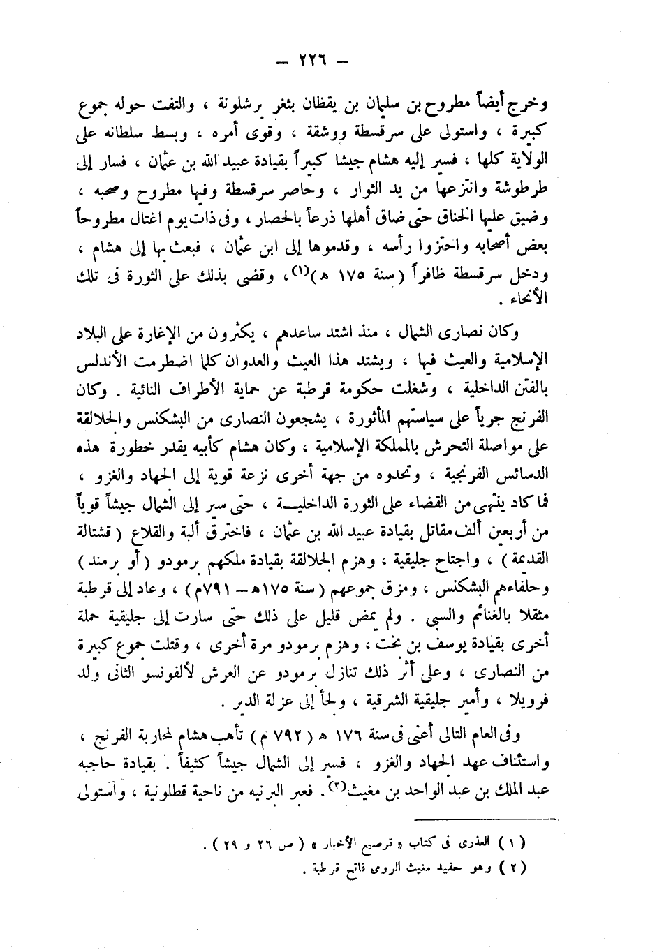 وخرج أيضا مطروح بن سليمان بن يقظان بثغر برشلونة، والتفت حوله جموع كبيرة، واستولى على سرقسطة ووشقة، وقوى أمره، وبسط سلطانه على الولاية كلها، فسير إليه هشام جيشا كبيرا بقيادة عبيد الله بن عثمان، فسار إلى طرطوشة وانتزعها من يد الثوار، وحاصر سرقسطة وفيها مطروح وصحبه، وضيق عليها الخناق حتى ضاق أهلها ذرعا بالحصار، وفي ذات يوم اغتال مطروحا بعض أصحابه واحتزوا رأسه، وقدموها إلى ابن عثمان، فبعث بها إلى هشام، ودخل سرقسطة ظافراً (سنة 175 هـ) (¬1)، وقضى بذلك على الثورة في تلك الأنحاء.