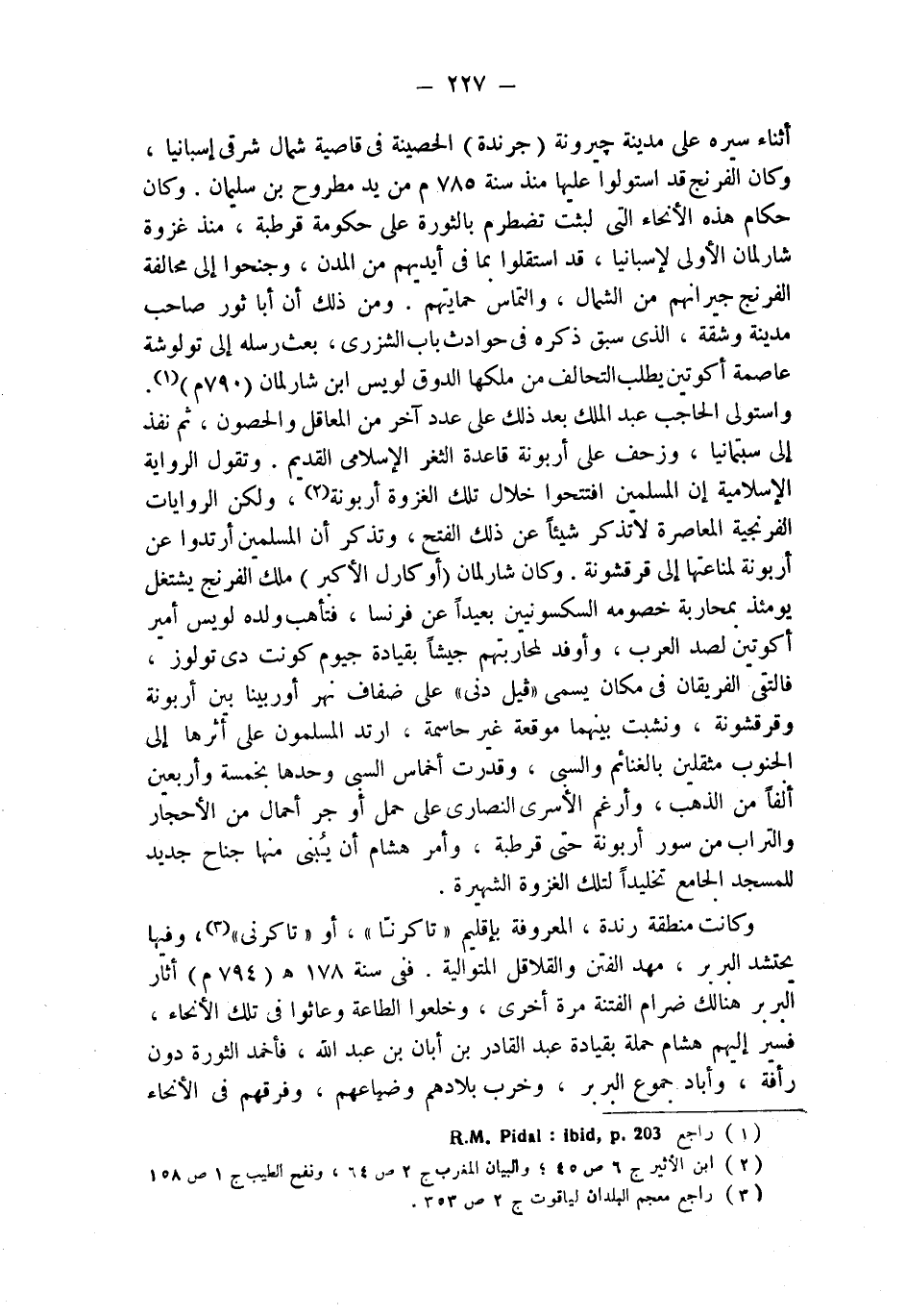 واستولى الحاجب عبد الملك بعد ذلك على عدد آخر من المعاقل والحصون، ثم نفذ إلى سبتمانيا، وزحف على أربونة قاعدة الثغر الإسلامي القديم. وتقول الرواية الإسلامية إن المسلمين افتتحوا خلال تلك الغزوة أربونة (¬2)، ولكن الروايات الفرنجية المعاصرة لا تذكر شيئاً عن ذلك الفتح، وتذكر أن المسلمين ارتدوا عن أربونة لمناعتها إلى قرقشونة. وكان شارلمان (أو كارل الأكبر) ملك الفرنج يشتغل يومئذ بمحاربة خصومه السكسونيين بعيدا عن فرنسا، فتأهب ولده لويس أمير أكوتين لصد العرب، وأوفد لمحاربتهم جيشا بقيادة جيوم كونت دى تولوز، فالتقى الفريقان في مكان يسمى " فيل دني " على ضفاف نهر أوربينا بين أربونة وقرقشونة، ونشبت بينهما موقعة غير حاسمة، ارتد المسلمون على أثرها إلى الجنوب مثقلين بالغنائم والسبي، وقدرت أخماس السبي وحدها بخمسة وأربعين ألفاً من الذهب، وأرغم الأسرى النصارى على حمل أو جر أحمال من الأحجار والتراب من سور أربونة حتى قرطبة، وأمر هشام أن يُبنى منها جناح جديد للمسجد الجامع تخليداً لتلك الغزوة الشهيرة.
