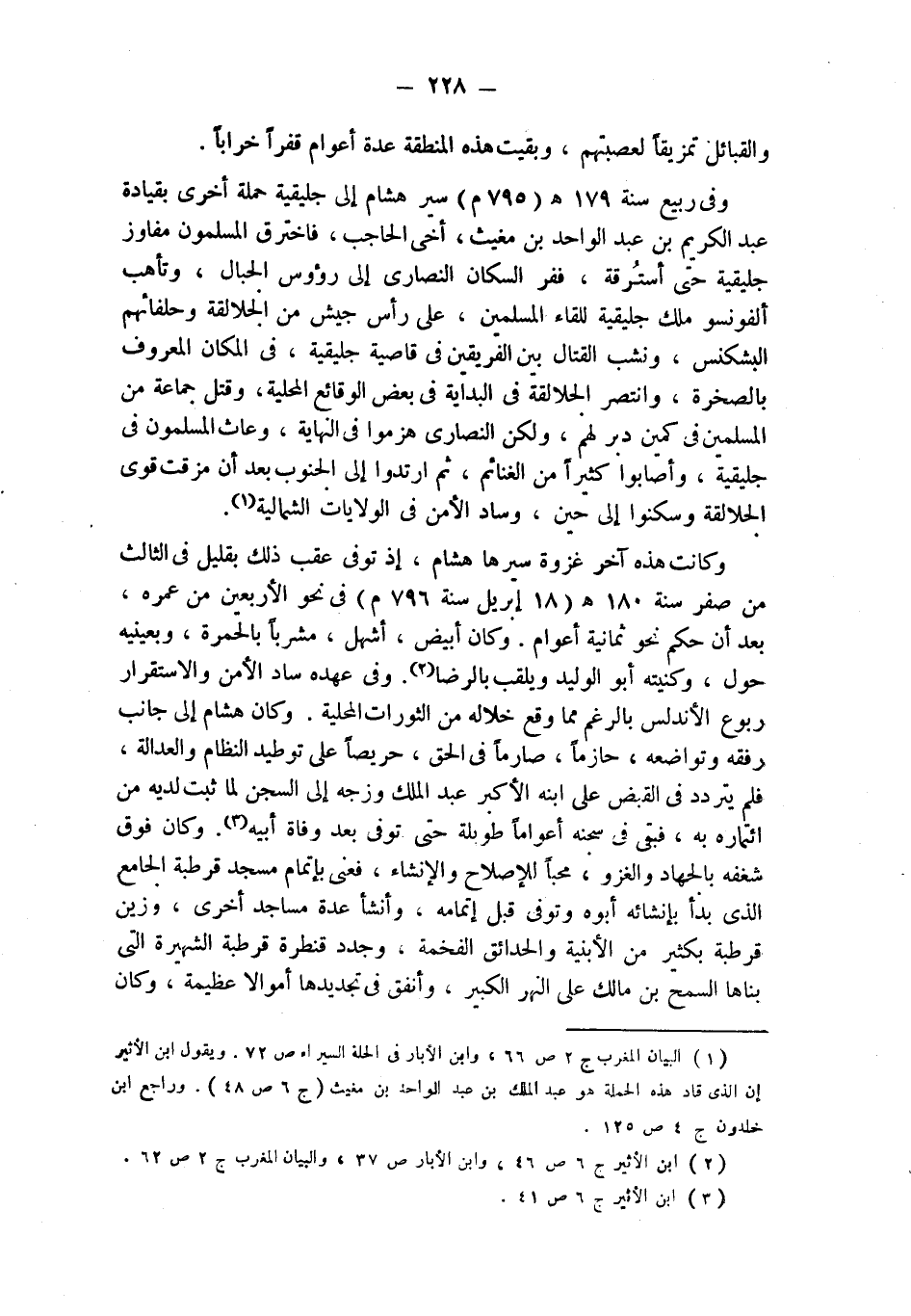 وكانت هذه آخر غزوة سيرها هشام، إذ توفي عقب ذلك بقليل في الثالث من صفر سنة 180 هـ (18 إبريل سنة 796 م) في نحو الأربعين من عمره، بعد أن حكم نحو ثمانية أعوام. وكان أبيض، أشهل، مشرباً بالحمرة، وبعينيه حول، وكنيته أبو الوليد ويلقب بالرضا (¬2). وفي عهده ساد الأمن والاستقرار ربوع الأندلس بالرغم مما وقع خلاله من الثورات المحلية. وكان هشام إلى جانب رفقه وتواضعه، حازماً، صارماً في الحق، حريصا على توطيد النظام والعدالة، فلم يتردد في القبض على ابنه الأكبر عبد الملك وزجه إلى السجن لما ثبت لديه من ائتماره به، فبقى في سجنه أعواماً طويلة حتى توفي بعد وفاة أبيه (¬3). وكان فوق شغفه بالجهاد والغزو، محباً للإصلاح والإنشاء، فعنى بإتمام مسجد قرطبة الجامع الذي بدأ بإنشائه أبوه وتوفي قبل إتمامه، وأنشأ عدة مساجد أخرى، وزين قرطبة بكثير من الأبنية والحدائق الفخمة، وجدد قنطرة قرطبة الشهيرة التي بناها السمح بن مالك على النهر الكبير، وأنفق في تجديدها أموالا عظيمة، وكان