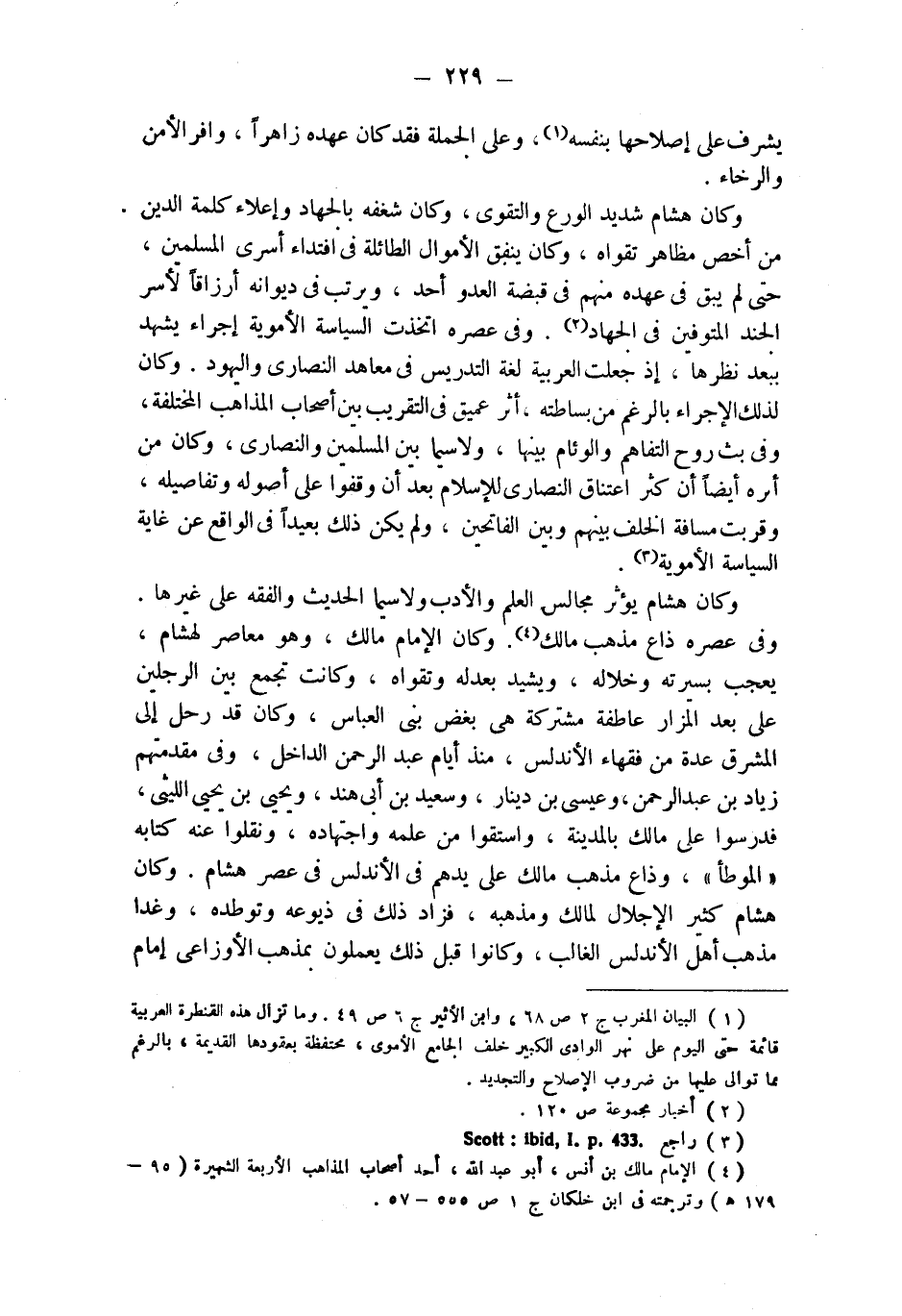 وفي عصره ذاع مذهب مالك (¬4). وكان الإمام مالك، وهو معاصر لهشام، يعجب بسيرته وخلاله، ويشيد بعدله وتقواه، وكانت تجمع بين الرجلين على بعد المزار عاطفة مشتركة هي بغض بني العباس، وكان قد رحل إلى المشرق عدة من فقهاء الأندلس، منذ أيام عبد الرحمن الداخل، وفي مقدمتهم زياد بن عبد الرحمن، وعيسى بن دينار، وسعيد بن أبي هند، ويحيى بن يحيى الليثي، فدرسوا على مالك بالمدينة، واستقوا من علمه واجتهاده، ونقلوا عنه كتابه " الموطأ "، وذاع مذهب مالك على يدهم في الأندلس في عصر هشام. وكان هشام كثير الإجلال لمالك ومذهبه، فزاد ذلك في ذيوعه وتوطده، وغدا مذهب أهل الأندلس الغالب، وكانوا قبل ذلك يعملون بمذهب الأوزاعي إمام