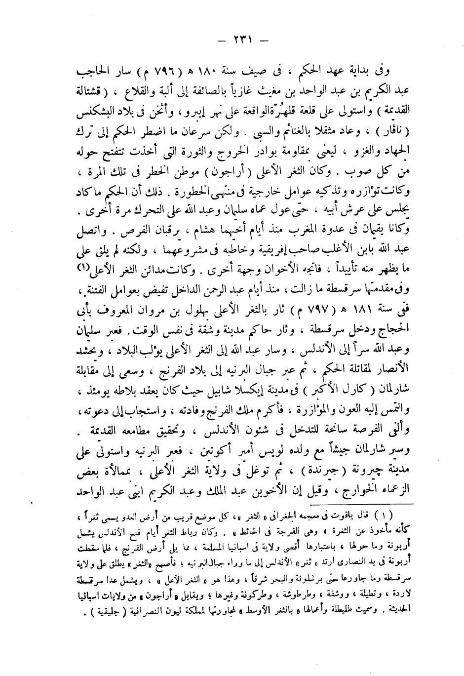 وكانا يقيمان في عدوة المغرب منذ أيام أخيهما هشام، يرقبان الفرص. واتصل عبد الله بابن الأغلب صاحب إفريقية وخاطبه في مشروعهما، ولكنه لم يلق على ما يظهر منه تأييداً، فاتجه الأخوان وجهة أخرى. وكانت مدائن الثغر الأعلى (¬1) وفي مقدمتها سرقسطة ما زالت، منذ أيام عبد الرحمن الداخل تفيض بعوامل الفتنة، ففي سنة 181 هـ (797 م) ثار بالثغر الأعلى بهلول بن مروان المعروف بأبى الحجاج ودخل سرقسطة، وثار حاكم مدينة وشقة في نفس الوقت. فعبر سليمان وعبد الله سراً إلى الأندلس، وسار عبد الله إلى الثغر الأعلى يؤلب البلاد، ويحشد الأنصار لمقاتلة الحكم، ثم عبر جبال البرنيه إلى بلاد الفرنج، وسعى إلى مقابلة شارلمان (كارل الأكبر) في مدينة إيكسلا شابيل حيث كان يعقد بلاطه يومئذ، والتمس إليه العون والمؤازرة، فأكرم ملك الفرنج وفادته، واستجاب إلى دعوته، وألفى الفرصة سانحة للتدخل في شئون الأندلس، وتحقيق مطامعه القديمة.