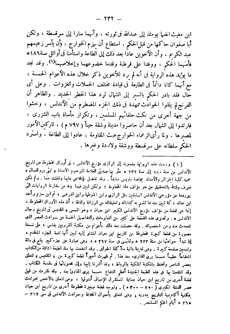 (¬1) وردت هذه الرواية منسوبة إلى الرازي مؤرخ الأندلس، في أوراق مخطوطة عن تاريخ الأندلس من سنة 180 إلى سنة 232هـ عثر بها صديقي العلامة المرحوم " ليفي بروفنسال " عميد كلية الجزائر والأستاذ بجامعة باريس سابقا. وقد تفضل بإطلاعي عليها ونقلت عنها. ولم نكن نعرف وقتئذ بالتحقيق من هو مؤلف هذا المخطوط؛ ولكن تبين فيما بعد من مقارنة الروايات التي يوردها عن مؤرخي الأندلس السابقين مثل الرازي وابن القوطية وابن الفرضي، ثم ابن حزم وأحمد ابن خالد، كما تبين منه مما تتسم به كتاباته وتعليقاته من الرزانة والدقة، أن هذه الأوراق المخطوطة، إنما هي قطعة من مؤلف مؤرخ الأندلس الكبير ابن حيان، وهو المسمى " المقتبس في تاريخ رجال الأندلس ". وتحتوي هذه القطعة على كثير من المعلومات والتفاصيل الحسنة عن حوادث العصر الذي نتحدث عنه وعن شخصياته. وقد حصلت بعد ذلك بأعوام من مكتبة القرويين بفاس، على نسخة مصورة من قطعة كبيرة مخطوطة من تاريخ ابن حيان المشار إليه تبين أنها تتمة للجزء المتقدم، إذ تبدأ حوادثها من سنة 233هـ وتننتهي في سنة 267هـ, وهي عبارة عن جزء كبير يقع في مائة وتسعين صفحة كبيرة. وهي قديمة بالية متآكلة الحوافي. وقد انتفعت بها منذ الطبعة الثالثة من الكتاب انتفاعا عظيما حسبما يرى القارىء بعد هذا. ثم ظهرت أخيرا قطعة كبيرة من " المقتبس " تتعلق بعصر الناصر وتحفظ بالمكتبة الملكية بالرباط، وقد أشرنا إليها وإلى محتوياتها في مقدمة الكتاب. وقد انتفعنا بها في هذه الطبعة الجديدة أعظم انتفاع حسبما يرى القارىء بعد. وقد نشرت من قبل قطعة أخرى من تاريخ ابن حيان بعناية المستشرق الإسباني أنتونيا، وهي تتعلق بالأخص بحوادث عصر الفتنة الكبرى (250 - 300هـ). وتوجد قطعة صغيرة مخطوطة أخرى من تاريخ ابن حيان بمكتبة أكاديمية التاريخ بمدريد، وهي تتعلق بأحوال الخلافة وحوادث الأندلس في سنى 362 - 365هـ أيام الحكم المستنصر.
