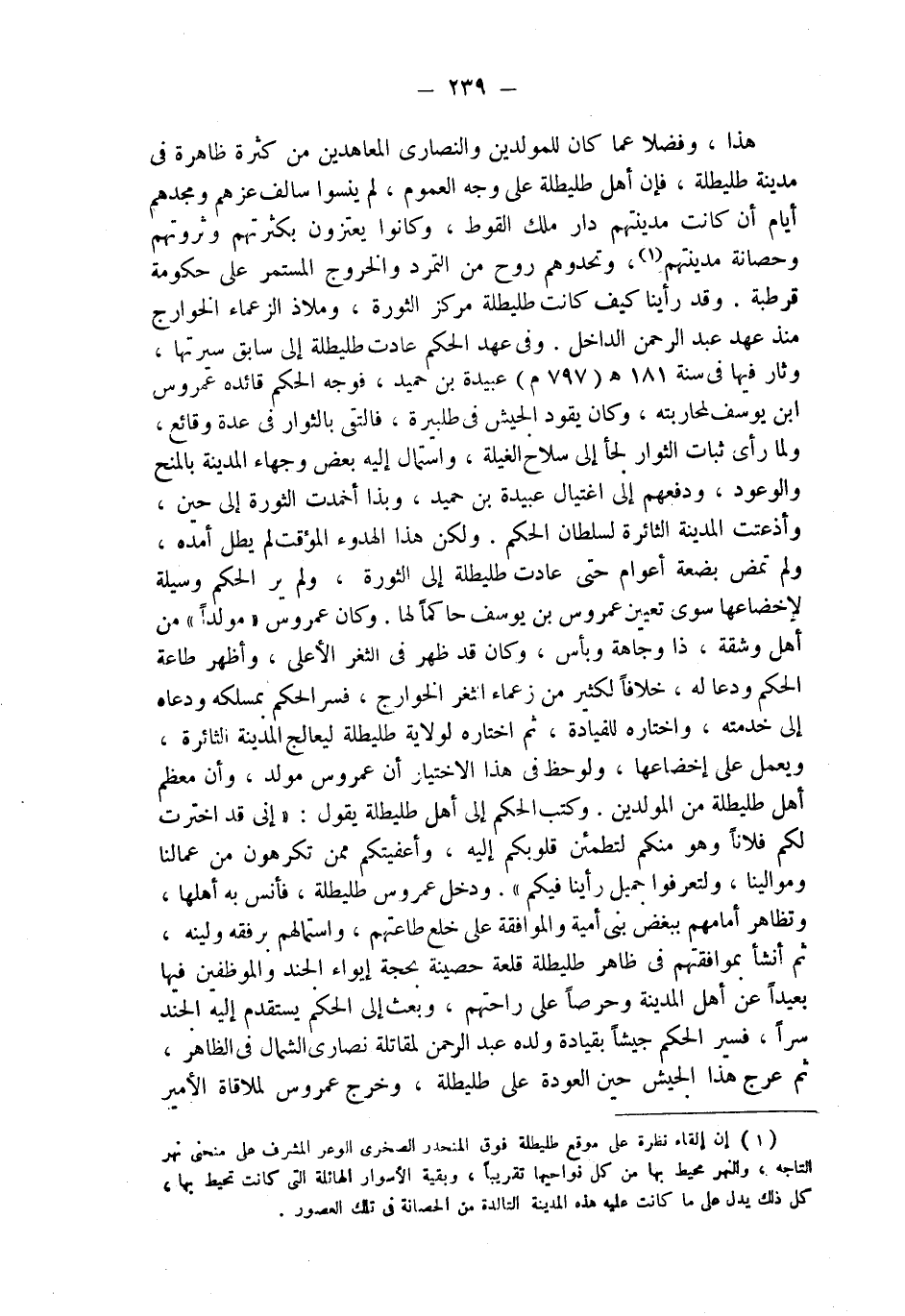 هذا، وفضلا عما كان للمولدين والنصارى المعاهدين من كثرة ظاهرة في مدينة طليطلة، فإن أهل طليطلة على وجه العموم، لم ينسوا سالف عزهم ومجدهم أيام أن كانت مدينتهم دار ملك القوط، وكانوا يعتزون بكثرتهم وثروتهم وحصانة مدينتهم (¬1)، وتحدوهم روح من التمرد والخروج المستمر على حكومة قرطبة. وقد رأينا كيف كانت طليطلة مركز الثورة، وملاذ الزعماء الخوارج منذ عهد عبد الرحمن الداخل. وفي عهد الحكم عادت طليطلة إلى سابق سيرتها، وثار فيها في سنة 181هـ (797 م) عبيدة بن حميد، فوجه الحكم قائده عمروس ابن يوسف لمحاربته، وكان يقود الجيش في طلبيرة، فالتقى بالثوار في عدة مواقع، ولما رأى ثبات الثوار لجأ إلى سلاح الغيلة، واستمال بعض وجهاء المدينة بالمنح والوعود، ودفعهم إلى اغتيال عبيدة بن حميد، وبذا أخمدت الثورة إلى حين، وأذعنت المدينة الثائرة لسلطان الحكم. ولكن هذا الهدوء المؤقت لم يطل أمده، ولم تمض بضعة أعوام حتى عادت طليطلة إلى الثورة، ولم ير الحكم وسيلة لإخضاعها سوى تعيين عمروس بن يوسف حاكماً لها. وكان عمروس " مولداً " من أهل وشقة، ذا وجاهة وبأس، وكان قد ظهر في الثغر الأعلى، وأظهر طاعة الحكم ودعا له، خلافاً لكثير من زعماء الثغر الخوارج، فسر الحكم بمسلكه ودعاه إلى خدمته، واختاره للقيادة، ثم اختاره لولاية طليطلة ليعالج المدينة الثائرة، ويعمل على إخضاعها، ولوحظ في هذا الاختيار أن عمروس مولد، وأن معظم أهل طليطلة من المولدين. وكتب الحكم إلى أهل طليطلة يقول: "إني قد اخترت لكم فلاناً وهو منكم لتطمئن قلوبكم إليه، وأعفيتكم ممن تكرهون من عمالنا وموالينا، ولتعرفوا جميل رأينا فيكم". ودخل عمروس طليطلة، فأنس به أهلها، وتظاهر أمامهم ببغض بني أمية والموافقة على خلع طاعتهم، واستمالهم برفقه ولينه، ثم أنشأ بموافقهم في ظاهر طليطلة قلعة حصينة بحجة إيواء الجند والموظفين فيها بعيداً عن أهل المدينة وحرصاً على راحتهم، وبعث إلى الحكم يستقدم إليه الجند سراً، فسير الحكم جيشاً بقيادة ولده عبد الرحمن لمقاتلة نصارى الشمال في الظاهر، ثم عرج هذا الجيش حين العودة على طليطلة، وخرج عمروس لملاقاة الأمير