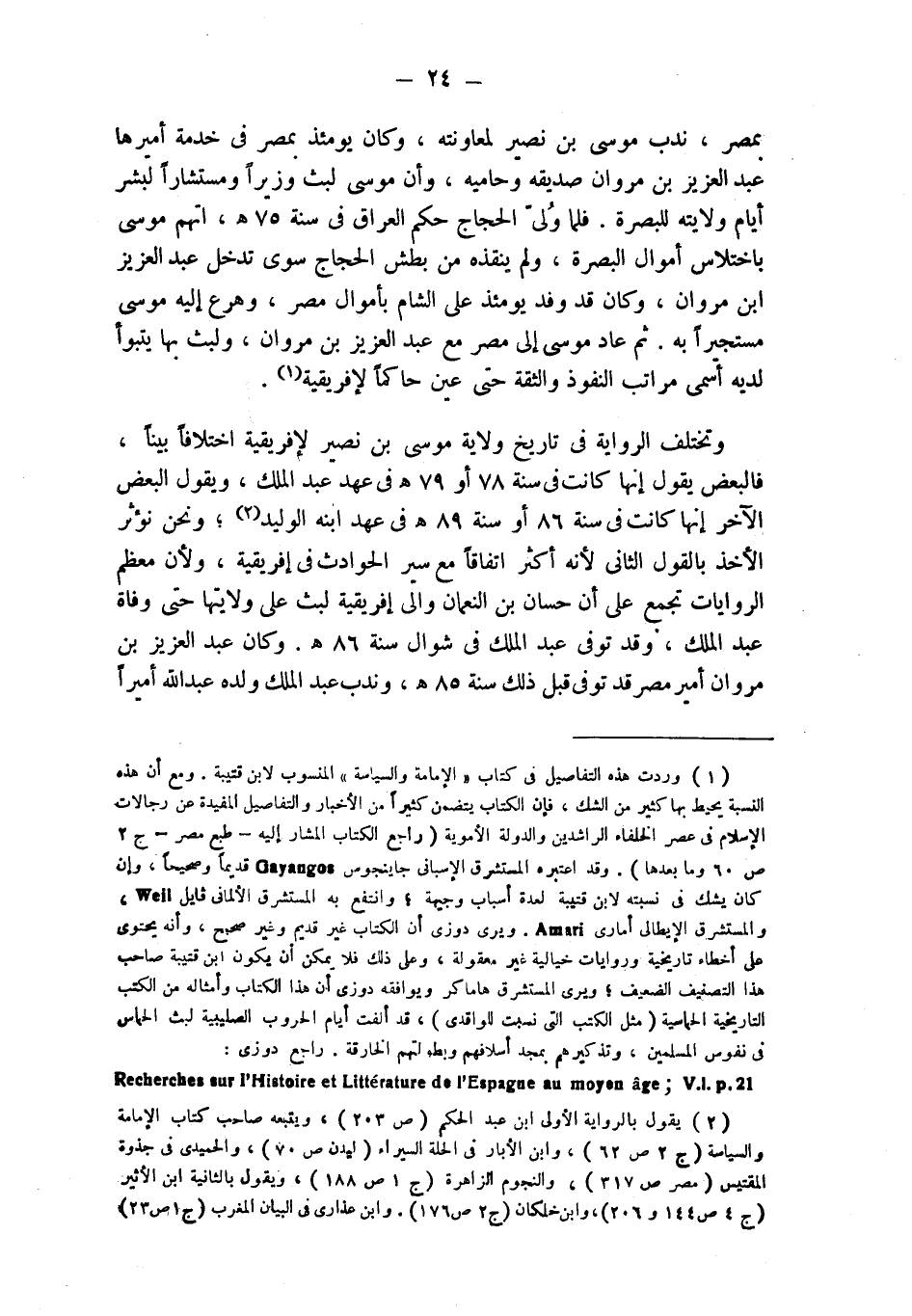 (¬2) يقول بالرواية الأولى ابن عبد الحكم (ص 203)، ويتبعه صاحب كتاب الإمامة والسياسة (ج 2 ص 62)، وابن الأبار في الحلة السيراء (ليدن ص 70)، والحميدي في جذوة المقتبس (مصر ص 317)، والنجوم الزاهرة (ج 1 ص 188)، ويقول بالثانية ابن الأثير (ج 4 ص 144 و206)، وابن خلكان (ج 2 ص 176). وابن عذارى في البيان المغرب (ج 1 ص 23).
