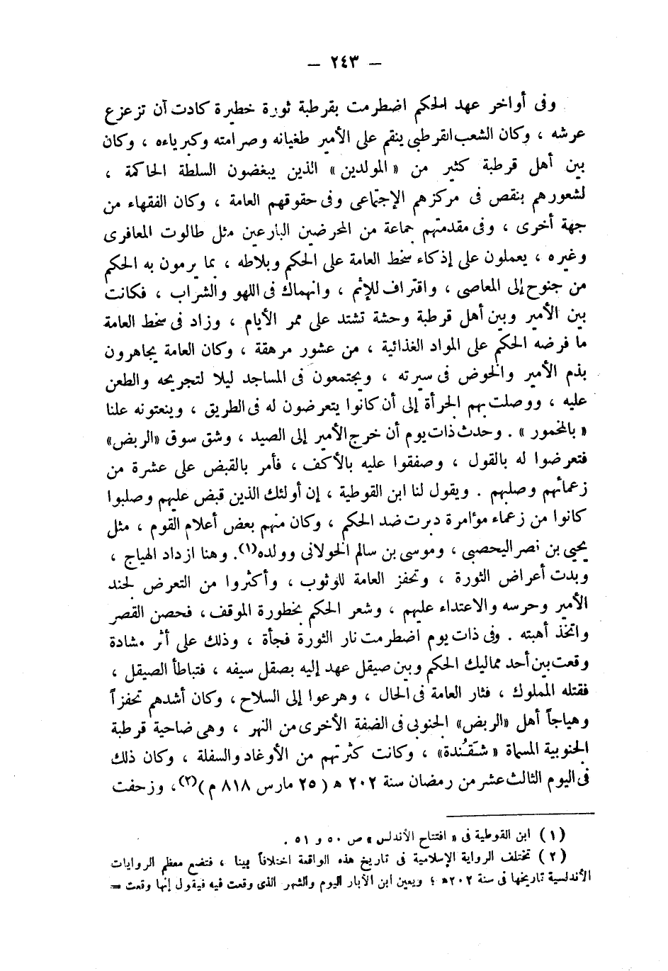 وفي أواخر عهد الحكم اضطرمت بقرطبة ثورة خطيرة كادت أن تزعزع عرشه، وكان الشعب القرطبي ينقم على الأمير طغيانه وصرامته وكبرياءه، وكان بين أهل قرطبة كثير من " المولدين " الذين يبغضون السلطة الحاكمة، لشعورهم بنقص في مركزهم الإجتماعي وفي حقوقهم العامة، وكان الفقهاء من جهة أخرى، وفي مقدمتهم جماعة من المحرضين البارعين مثل طالوت المعافري وغيره، يعملون على إذكاء سخط العامة على الحكم وبلاطه، بما يرمون به الحكم من جنوح إلى المعاصي، واقتراف للإثم، وانهماك في اللهو والشراب، فكانت بين الأمير وبين أهل قرطبة وحشة تشتد على ممر الأيام، وزاد في سخط العامة ما فرضه الحكم على المواد الغذائية، من عشور مرهقة، وكان العامة يجاهرون بذم الأمير والخوض في سيرته، ويجتمعون في المساجد ليلا لتجريحه والطعن عليه، ووصلت بهم الجرأة إلى أن كانوا يتعرضون له في الطريق، وينعتونه علنا " بالمخمور ". وحدث ذات يوم أن خرج الأمير إلى الصيد، وشق سوق "الربض" فتعرضوا له بالقول، وصفقوا عليه بالأكف، فأمر بالقبض على عشرة من زعمائهم وصلبهم. ويقول لنا ابن القوطية، إن أولئك الذين قبض عليهم وصلبوا كانوا من زعماء مؤامرة دبرت ضد الحكم، وكان منهم بعض أعلام القوم، مثل يحيى بن نصر اليحصبي، وموسى بن سالم الخولاني وولده (¬1). وهنا ازداد الهياج، وبدت أعراض الثورة، وتحفز العامة للوثوب، وأكثروا من التعرض لجند الأمير وحرسه والاعتداء عليهم، وشعر الحكم بخطورة الموقف، فحصن القصر واتخذ أهبته. وفي ذات يوم اضطرمت نار الثورة فجأة، وذلك على أثر مشادة وقعت بين أحد مماليك الحكم وبين صيقل عهد إليه بصقل سيفه، فتباطأ الصيقل، فقتله المملوك، فثار العامة في الحال، وهرعوا إلى السلاح، وكان أشدهم تحفزاً وهياجاً أهل "الربض" الجنوبي في الضفة الأخرى من النهر، وهي ضاحية قرطبة الجنوبية المسماة (شَقُندة)، وكانت كثرتهم من الأوغاد والسفلة، وكان ذلك في اليوم الثالث عشر من رمضان سنة 202 هـ (25 مارس 818 م) (¬2)، وزحفت