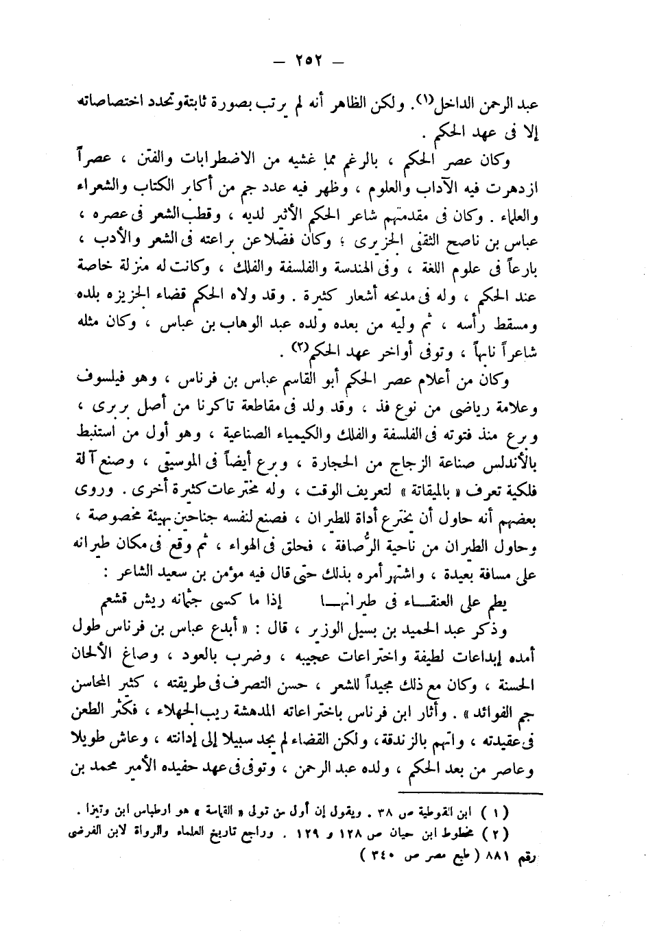 وكان من أعلام عصر الحكم أبو القاسم عباس بن فرناس، وهو فيلسوف وعلامة رياضي من نوع فذ، وقد ولد في مقاطعة تاكرنا من أصل بربري، وبرع منذ فتوته في الفلسفة والفلك والكيمياء الصناعية، وهو أول من استنبط بالأندلس صناعة الزجاج من الحجارة، وبرع أيضاً في الموسيقى، وصنع آلة فلكية تعرف " بالميقاتة " لتعريف الوقت، وله مخترعات كثيرة أخرى. وروى بعضهم أنه حاول أن يخترع أداة للطيران، فصنع لنفسه جناحين بهيئة مخصوصة، وحاول الطيران من ناحية الرُّصافة، فحلق في الهواء، ثم وقع في مكان طيرانه على مسافة بعيدة، واشتهر أمره بذلك حتى قال فيه مؤمن بن سعيد الشاعر: