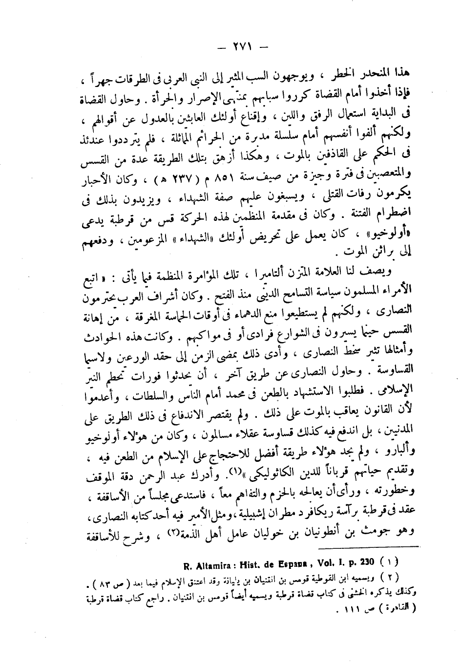 هذا المنحدر الخطر، ويوجهون السب المثير إلى النبي العربي في الطرقات جهراً، فإذا أخذوا أمام القضاة كرروا سبابهم بمنتهى الإصرار والجرأة. وحاول القضاة في البداية استعمال الرفق واللين، وإقناع أولئك العابثين بالعدول عن أقوالهم، ولكنهم ألفوا أنفسهم أمام سلسلة مدبرة من الجرائم المماثلة، فلم يترددوا عندئذ في الحكم على القاذفين بالموت، وهكذا أزهق بتلك الطريقة عدة من القسس والمتعصبين في فترة وجيزة من صيف سنة 851 م (237هـ)، وكان الأحبار يكرمون رفات القتلى، ويسبغون عليهم صفة الشهداء، ويزيدون بذلك في اضطرام الفتنة. وكان في مقدمة المنظمين لهذه الحركة قس من قرطبة يدعى "أولوخيو"، كان يعمل على تحريض أولئك "الشهداء" المزعومين، ودفعهم إلى براثن الموت.