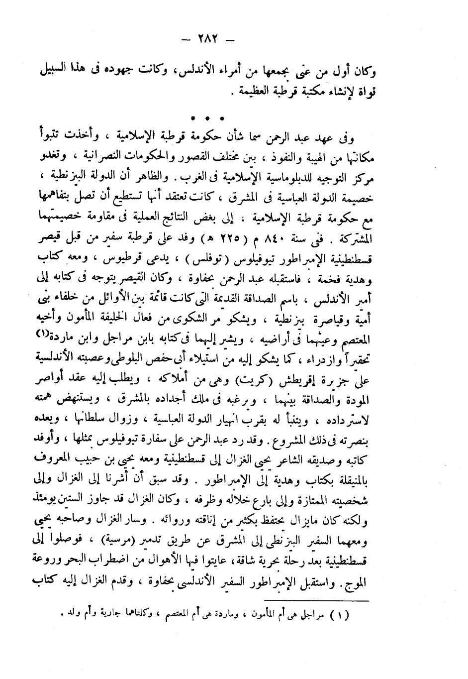 وفي عهد عبد الرحمن سما شأن حكومة قرطبة الإسلامية، وأخذت تتبوأ مكانتها من الهيبة والنفوذ، بين مختلف القصور والحكومات النصرانية، وتغدو مركز التوجيه للدبلوماسية الإسلامية في الغرب. والظاهر أن الدولة البيزنطية، خصيمة الدولة العباسية في المشرق، كانت تعتقد أنها تستطيع أن تصل بتفاهمها مع حكومة قرطبة الإسلامية، إلى بعض النتائج العملية في مقاومة خصيمتهما المشتركة. ففي سنة 840 م (225 هـ) وفد على قرطبة سفير من قبل قيصر قسطنطينية الإمبراطور تيوفيلوس (توفلس)، يدعى قرطيوس، ومعه كتاب وهدية فخمة، فاستقبله عبد الرحمن بحفاوة، وكان القيصر يتوجه في كتابه إلى أمير الأندلس، باسم الصداقة القديمة التي كانت قائمة بين الأوائل من خلفاء بني أمية وقياصرة بيزنطية، ويشكو مر الشكوى من فعال الخليفة المأمون وأخيه المعتصم وعيثهما في أراضيه، ويشير إليهما في كتابه بابن مراجل وابن ماردة (¬1) تحقيراً وازدراء، كما يشكو إليه من استيلاء أبى حفص البلوطي وعصبته الأندلسية على جزيرة إقريطش (كريت) وهي من أملاكه، ويطلب إليه عقد أواصر المودة والصداقة بينهما، ويرغبه في ملك أجداده بالمشرق، ويستنهض همته لاسترداده، ويتنبأ له بقرب انهيار الدولة العباسية، وزوال سلطانها، ويعده بنصرته في ذلك المشروع. وقد رد عبد الرحمن على سفارة تيوفيلوس بمثلها، وأوفد كاتبه وصديقه الشاعر يحيى الغزال إلى قسطنطينية ومعه يحيى بن حبيب المعروف بالمنيقلة بكتاب وهدية إلى الإمبراطور. وقد سبق أن أشرنا إلى الغزال وإلى شخصيته الممتازة وإلى بارع خلاله وظرفه، وكان الغزال قد جاوز الستين يومئذ ولكنه كان مايزال يحتفظ بكثير من إناقته وروائه. وسار الغزال وصاحبه يحيى ومعهما السفير البيزنطي إلى المشرق عن طريق تدمير (مرسية)، فوصلوا إلى قسطنطينية بعد رحلة بحرية شاقة، عاينوا فيها الأهوال من اضطراب البحر وروعة الموج. واستقبل الإمبراطور السفير الأندلسي بحفاوة، وقدم الغزال إليه كتاب