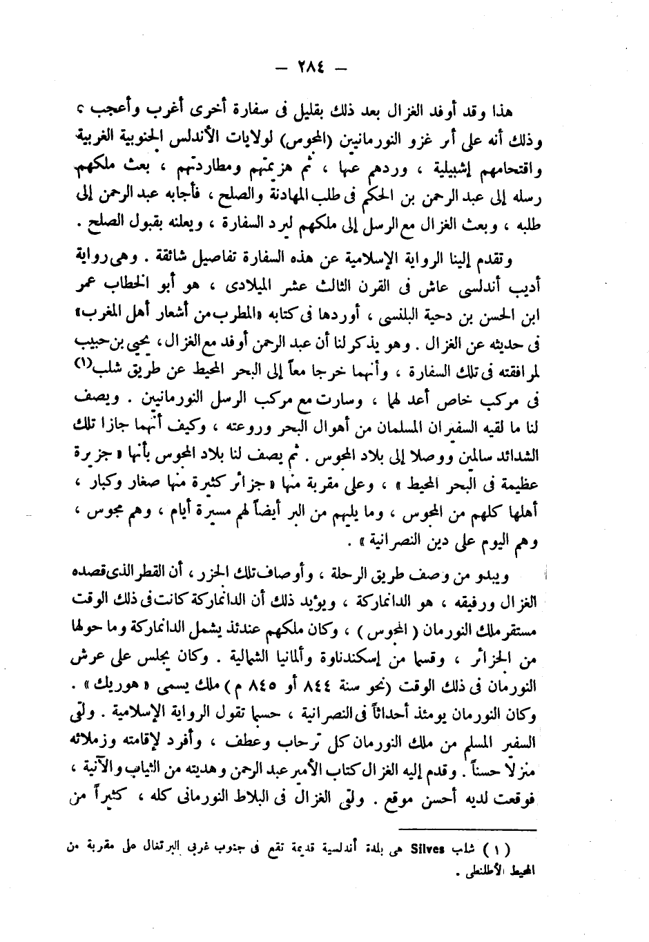 وتقدم إلينا الرواية الإسلامية عن هذه السفارة تفاصيل شائقة. وهي رواية أديب أندلسي عاش في القرن الثالث عشر الميلادي، هو أبو الخطاب عمر ابن الحسن بن دحية البلنسي، أوردها في كتابه "المطرب من أشعار أهل المغرب" في حديثه عن الغزال. وهو يذكر لنا أن عبد الرحمن أوفد مع الغزال، يحيى بن حبيب لمرافقته في تلك السفارة، وأنهما خرجا معاً إلى البحر المحيط عن طريق شلب (¬1) في مركب خاص أعد لهما، وسارت مع مركب الرسل النورمانيين. ويصف لنا ما لقيه السفيران المسلمان من أهوال البحر وروعته، وكيف أنهما جازا تلك الشدائد سالمين ووصلا إلى بلاد المجوس. ثم يصف لنا بلاد المجوس بأنها " جزيرة عظيمة في البحر المحيط "، وعلى مقربة منها " جزائر كثيرة منها صغار وكبار، أهلها كلهم من المجوس، وما يليهم من البر أيضا لهم مسيرة أيام، وهم مجوس، وهم اليوم على دين النصرانية ".