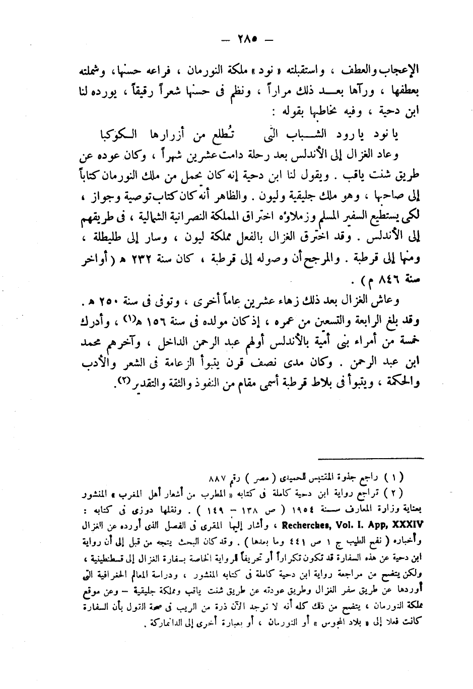 (¬2) راجع رواية ابن دحية كاملة في كتابه " المطرب من أشعار أهل المغرب " المنشور بعناية وزارة المعارف سنة 1954 (ص 138 - 149). ونقلها دوزي في كتابه: Recherches, Vol.I.App, XXXIV، وأشار إليها المقري في الفصل الذي أورده عن الغزال وأخباره (نفح الطيب ج 1 ص 441 وما بعدها). وقد كان البحث يتجه من قبل إلى أن رواية ابن دحية عن هذه السفارة قد تكون تكراراً أو تحريفاً للرواية الخاصة بسفارة الغزال إلى قسطنطينية، ولكن يتضح من مراجعة رواية ابن دحية كاملة في كتابه المنشور، ودراسة المعالم الجغرافية التي أوردها عن طريق سفر الغزال وطريق عودته عن طريق شنت ياقب ومملكة جليقية - وعن موقع مملكة النورمان، يتضح من ذلك كله أنه لا توجد الآن ذرة من الريب في صحة القول بأن السفارة كانت فعلا إلى " بلاد المجوس " أو النورمان، أو بعبارة أخرى إلى الدانماركة.