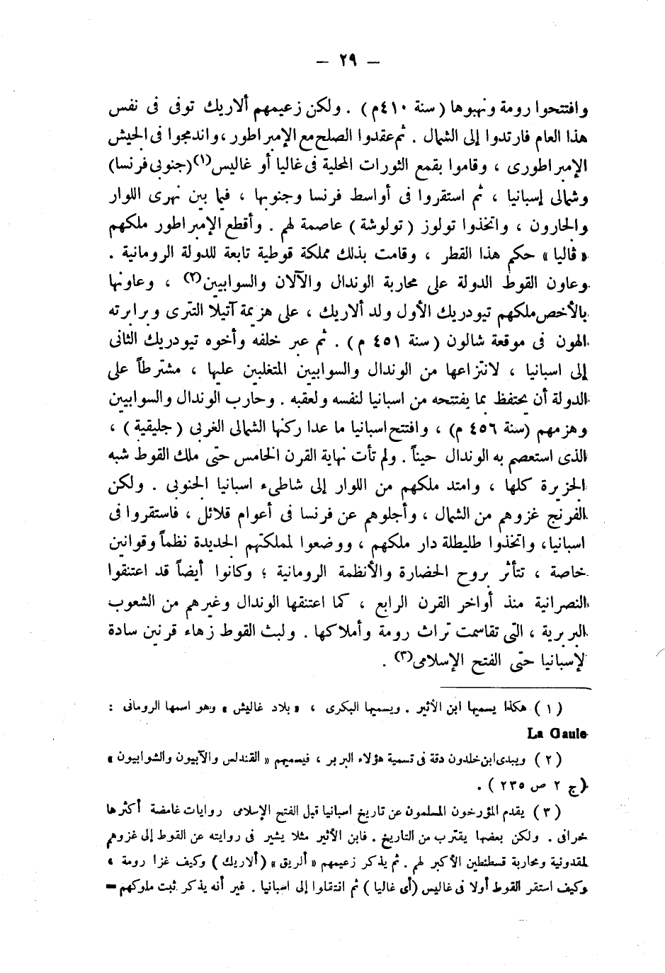 (¬3) يقدم المؤرخون المسلمون عن تاريخ اسبانيا قبل الفتح الإسلامي روايات غامضة أكثرها خرافي. ولكن بعضها يقترب من التاريخ. فابن الأثير مثلا يشير في روايته عن القوط إلى غزوهم لمقدونية ومحاربة قسطنطين الأكبر لهم. ثم يذكر زعيمهم " ألريق " (ألاريك) وكيف غزا رومة، وكيف استقر القوط أولا في غاليس (أى غاليا) ثم انتقلوا إلى اسبانيا. غير أنه يذكر ثبت ملوكهم=