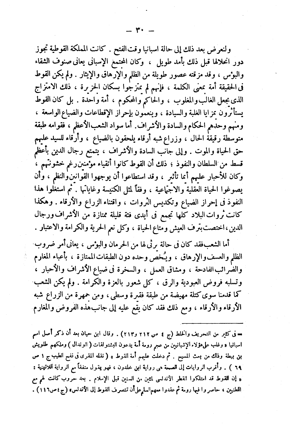 ولنعرض بعد ذلك إلى حالة اسبانيا وقت الفتح. كانت المملكة القوطية تجوز دور انحلالها قبل ذلك بأمد طويل، وكان المجتمع الإسباني يعاني صنوف الشقاء والبؤس، وقد مزقته عصور طويلة من الظلم والإرهاق والإيثار. ولم يكن القوط في الحقيقة أمة بمعنى الكلمة، فإنهم لم يمتزجوا بسكان الجزيرة، ذلك الامتزاج الذي يجعل الغالب والمغلوب، والحاكم والمحكوم، أمة واحدة. بل كان القوط يستأثرون بمزايا الغلبة والسيادة، وينعمون بإحراز الإقطاعات والضياع الواسعة، ومنهم وحدهم الحكام والسادة والأشراف. أما سواد الشعب الأعظم، فقوامه طبقة متوسطة رقيقة الحال، وزراع شبه أرقاء يلحقون بالضياع، وأرقاء للسيد عليهم حق الحياة والموت. وإلى جانب السادة والأشراف، يتمتع رجال الدين بأعظم قسط من السلطان والنفوذ؛ ذلك أن القوط كانوا أتقياء مؤمنين رغم خشونتهم، وكان للأحبار عليهم أيما تأثير، وقد استطاعوا أن يوجهوا القوانين والنظم، وأن يصوغوا الحياة العقلية والاجتماعية، وفقا لمثل الكنيسة وغاياتها. ثم استغلوا هذا النفوذ في إحراز الضياع وتكديس الثروات، واقتناء الزراع والأرقاء. وهكذا كانت ثروات البلاد كلها تجمع في أيدي فئة قليلة ممتازة من الأشراف ورجال الدين، اختصت بترف العيش ومتاع الحياة، وكل نعم الحرية والكرامة والاعتبار.