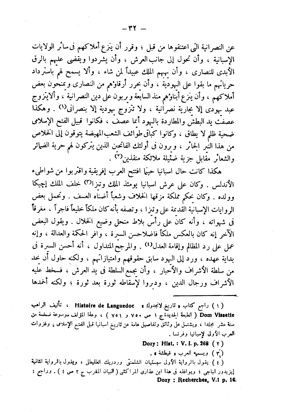 (¬1) راجع كتاب " تاريخ لانجدوك " Histoire de Languedoc، تأليف الراهب Dom Vissette ( الطبعة الجديدة ج 1 ص 750 و751)، وهذا المؤلف موسوعة ضخمة من ستة عشر مجلدا، ويشتمل على وثائق وتفاصيل هامة عن تاريخ اسبانيا قبل الفتح الإسلامي، وغزوات العرب الأولى لإسبانيا وفرنسا.