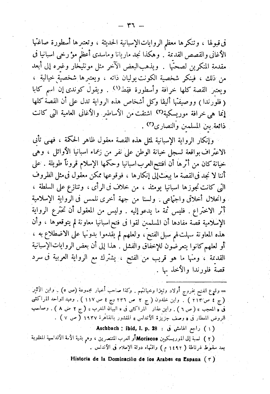 ْوإنكار الرواية الإسبانية لمثل هذه القصة معقول ظاهر الحكمة، فهي تأبى الاعتراف بواقعة تسجل خيانة الوطن على نفر من زعماء اسبانيا الأوائل، وهي خيانة كان من أثرها أن افتتح العرب اسبانيا وحكمها الإسلام قروناً طويلة. على أننا نجد في القصة ما يبعث إلى إنكارها، فوقوعها ممكن معقول في مثل الظروف التي كانت تجوزها اسبانيا يومئذ، من خلاف في الرأي، وتنازع على السلطة، وانحلال أخلاقي واجتماعي. ولسنا من جهة أخرى نلمس في الرواية الإسلامية أثر الاختراع. فليس ثمة ما يدعو إليه. وليس من المعقول أن تخترع الرواية الإسلامية قصة مفادها أن المسلمين لقوا في فتح اسبانيا معاونة لم يتوقعوها، وأن هذه المعاونة سهلت لهم سبل الفتح، ولعلهم لم يقدموا بدونها على الاضطلاع به، أو لعلهم كانوا يتعرضون للإخفاق والفشل. هذا إلى أن بعض الروايات الإسبانية ْالقديمة، ومنها ما هو قريب من الفتح، يشترك مع الرواية العربية في سرد قصة فلورندا والأخذ بها.