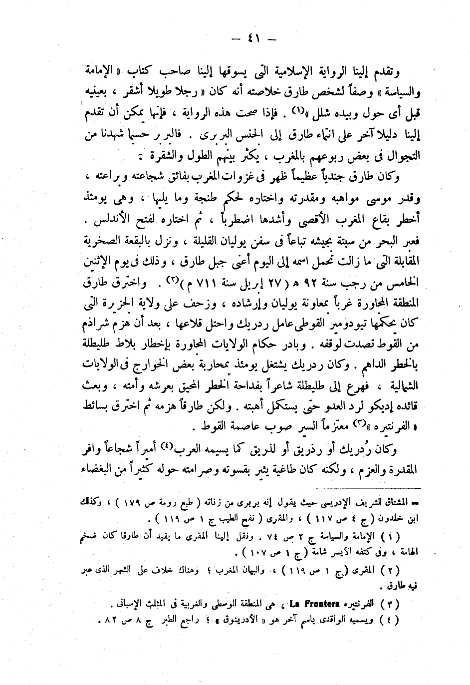 وتقدم إلينا الرواية الإسلامية التي يسوقها الينا صاحب كتاب " الإمامة والسياسة " وصفا لشخص طارق خلاصته أنه كان " رجلا طويلا أشقر، بعينيه قبل أى حول وبيده شلل " (¬1). فإذا صحت هذه الرواية، فإنها يمكن أن تقدم إلينا دليلا آخر على انتماء طارق إلى الجنس البربري. فالبربر حسبما شهدنا من التجوال في بعض ربوعهم بالمغرب، يكثر بينهم الطول والشقرة.