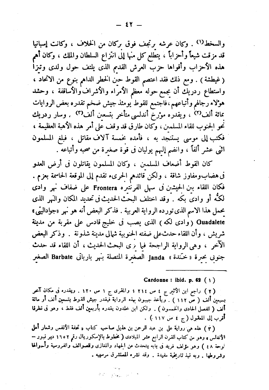 (¬2) راجع ابن الأثير ج 4 ص 214؛ والمقري ج 1 ص 120. ويقدره في مكان آخر بسبعين ألف (ص 112). ويأخذ جيبون بهذه الرواية فيقدر جيش القوط بتسعين ألف أو مائة ألف (الفصل الحادي والخمسون). ولكن ابن خلدون يقدره بأربعين ألف فقط، وهو في نظرنا أقرب إلى المعقول (ج 4 ص 117).