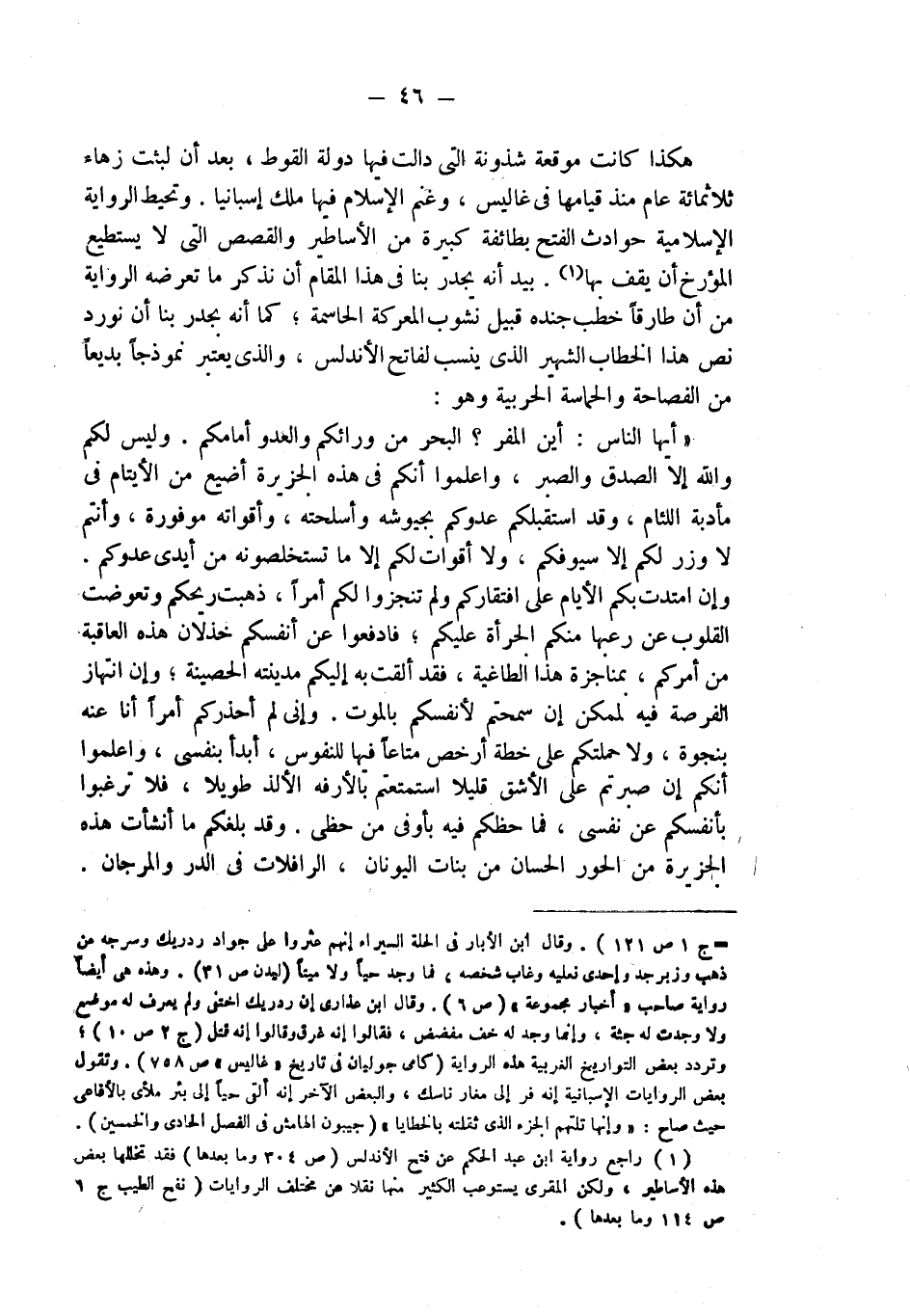 هكذا كانت موقعة شذونة التي دالت فيها دولة القوط، بعد أن لبثت زهاء ثلاثمائة عام منذ قيامها في غاليس، وغنم الإسلام فيها ملك إسبانيا. وتحيط الرواية الإسلامية حوادث الفتح بطائفة كبيرة من الأساطير والقصص التي لا يستطيع المؤرخ أن يقف بها (¬1). بيد أنه يجدر بنا في هذا المقام أن نذكر ما تعرضه الرواية من أن طارقا خطب جنده قبيل نشوب المعركة الحاسمة؛ كما أنه يجدر بنا أن نورد نص هذا الخطاب الشهير الذي ينسب لفاتح الأندلس، والذي يعتبر نموذجا بديعا من الفصاحة والحماسة الحربية وهو: