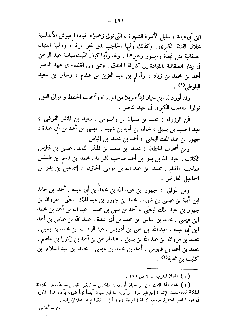 (¬2) نقلنا هذا الثبت عن ابن حيان أورده في المقتبس - السفر الخامس - مخطوط الخزانة الملكية الذي سبقت الإشارة إليه غير مرة. وأورد لنا ابن حيان أيضاً ثبتاً طويلا بأسماء عمال الكور في عهد الناصر استغرق صفحة كاملة (لوحة 153 أ). ولكنا لم نجد محلا لإيراده.
