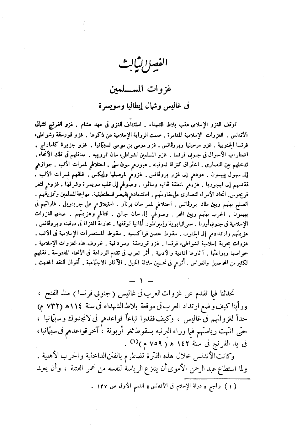 توقف الغزو الإسلامي عقب بلاط الشهداء. استئناف الغزو في عهد هشام. غزو الفرنج لشمالي الأندلس. الغزوات الاسلامية المغامرة. صمت الرواية الإسلامية عن ذكرها. غزو قورسقة وشواطىء فرنسا الجنوبية. غزو مرسيليا وبروفانس. غزو موسى بن موسى لسبتمانيا. غزو جزيرة كاماراج. اضطراب الأحوال في جنوبي فرنسا. غزو المسلمين لشواطىء سان تروبيه. معاقلهم في تلك الأنحاء. تدخلهم بين النصارى. اختراق الغزاة لدوفينه. عبورهم مون سني. احتلالهم لممرات الألب. جوازهم الى سهول بييمون. عودهم إلى غزو بروفانس. غزوهم لمرسيليا وإيكس. غلقهم لممرات الألب. تقدمهم إلى ليجوريا. غزوهم لمنطقة فاليه وسافوا. وصولهم إلى قلب سويسرة وشرقها. غزوهم لثغر فريجوس. اتحاد الأمراء النصارى على مقاومتهم. استنجادهم بقيصر قسطنطينية. مهاجمة المسلمين وتمزيقهم. الصلح بينهم وبين ملك بروفانس. احتلالهم لممر سان برنار. استيلاؤهم على جرينوبل. غاراتهم في بييمون. الحرب بينهم وبين المجر. وصولهم إلى سان جالن. قتالهم وهزيمتهم. صدى الغزوات الإسلامية في جنوبي أوربا. سعي البابوية وإمبراطور ألمانيا لوقفها. محاربة الغزاة في دوفينه وبروفانس. هزيمتهم وارتدادهم إلى الجنوب. سقوط حصن فراكسنيه. سقوط المستعمرات الإسلامية في الألب. غزوات بحرية إسلامية لشواطىء فرنسا. غزو قورسقة وسردانية. ظروف هذه الغزوات الإسلامية. خواصها وبواعثها. آثارها المادية والأدبية. أثر العرب في تقدم الزراعة في الأنحاء المفتوحة. نقلهم لكثير من المحاصيل والغراس. أثرهم في تحسين سلالة الخيل. الآثار الاجتماعية. أقوال النقد الحديث.