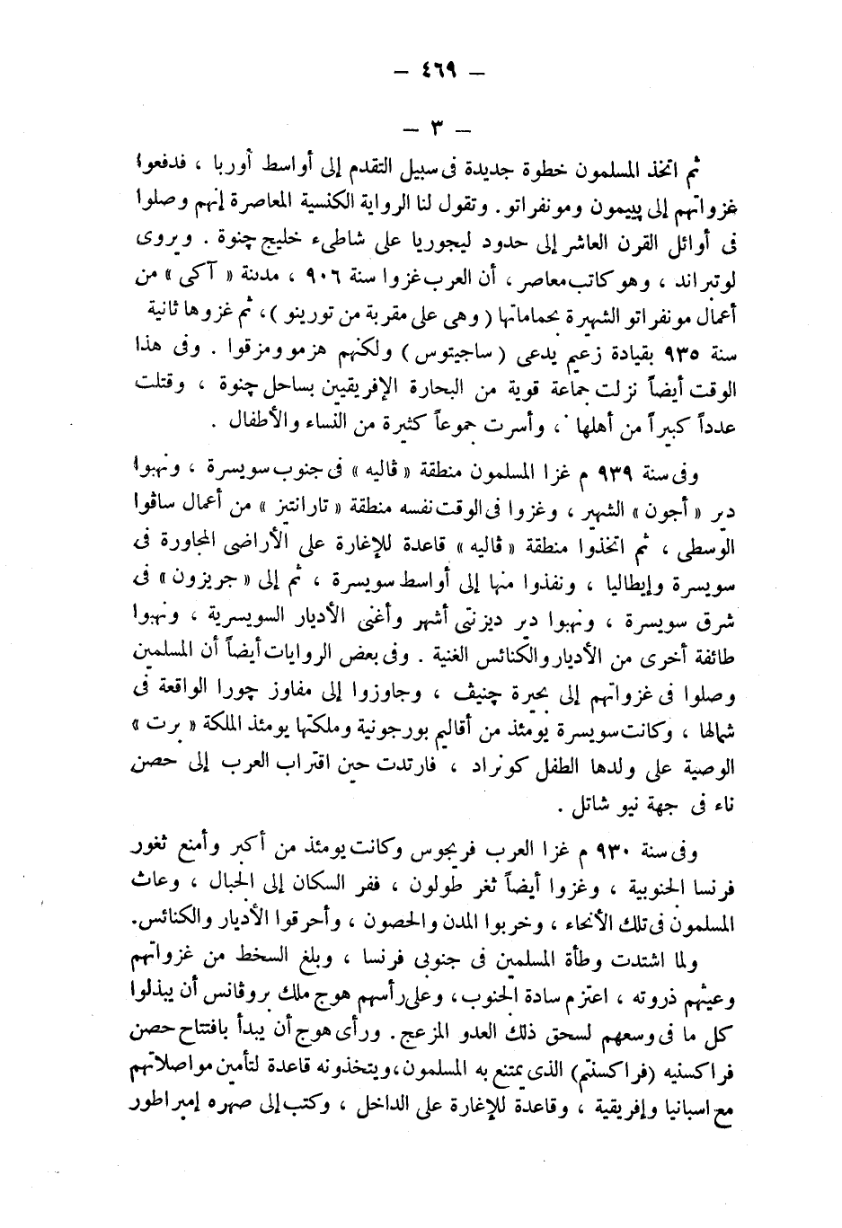 وفي سنة 939 م غزا المسلمون منطقة " فاليه " في جنوب سويسرة، ونهبوا دير " أجون " الشهير، وغزوا في الوقت نفسه منطقة " تارانتيز " من أعمال سافوا الوسطى، ثم اتخذوا منطقة " فاليه " قاعدة للإغارة على الأراضي المجاورة في سويسرة وإيطاليا، ونفذوا منها إلى أواسط سويسرة، ثم إلى " جريزون " في شرق سويسرة، ونهبوا دير ديزنتي أشهر وأغنى الأديار السويسرية، ونهبوا طائفة أخرى من الأديار والكنائس الغنية. وفي بعض الروايات أيضاً أن المسلمين وصلوا في غزواتهم إلى بحيرة جنيف، وجاوزوا إلى مفاوز جورا الواقعة في شمالها، وكانت سويسرة يومئذ من أقاليم بورجونية وملكتها يومئذ الملكة " برت " الوصية على ولدها الطفل كونراد، فارتدت حين اقتراب العرب إلى حصن ناء في جهة نيو شاتل.