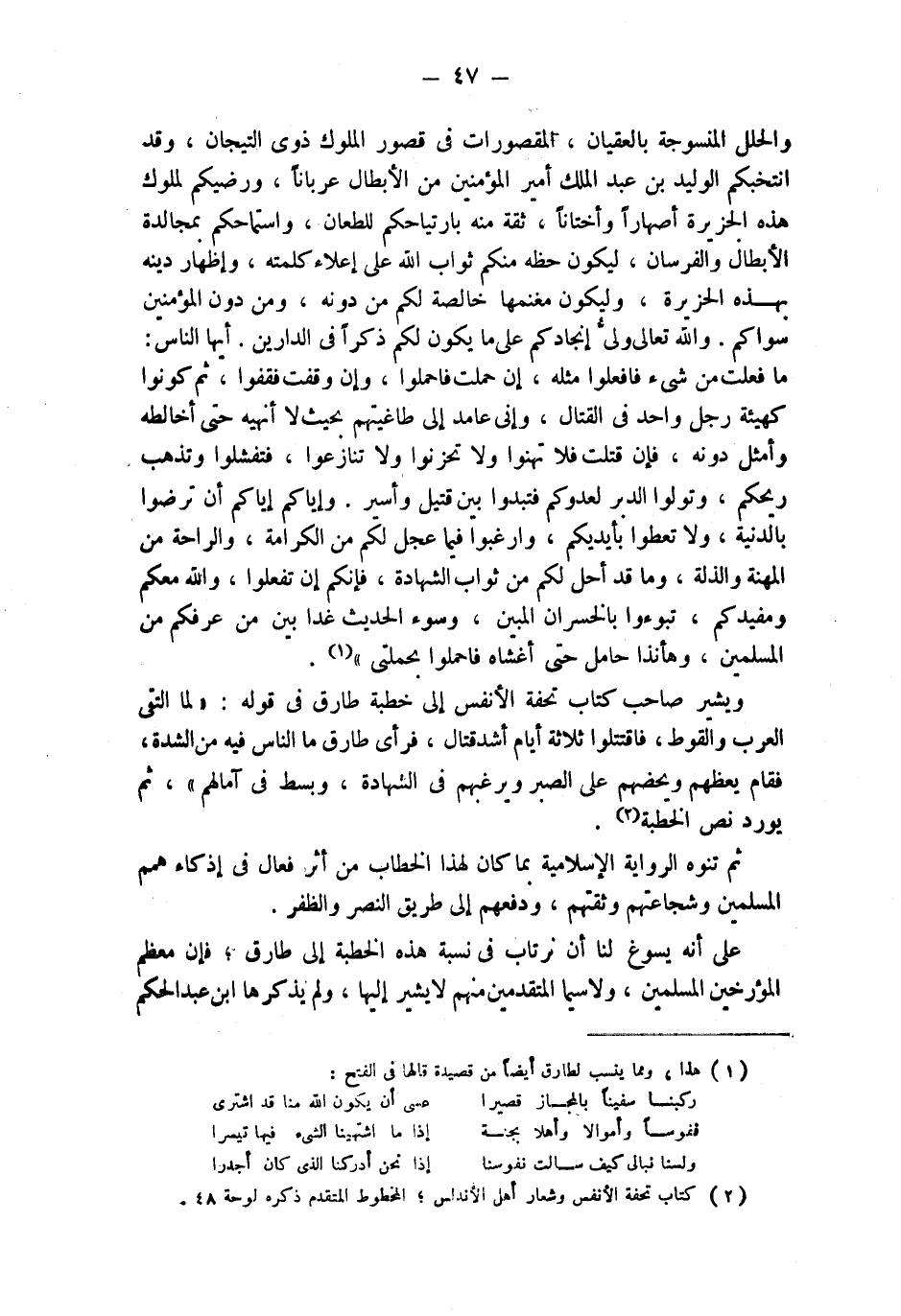 على أنه يسوغ لنا أن نرتاب في نسبة هذه الخطبة إلى طارق؛ فإن معظم المؤرخين المسلمين، ولاسيما المتقدمين منهم لايشير إليها، ولم يذكرها ابن عبد الحكم