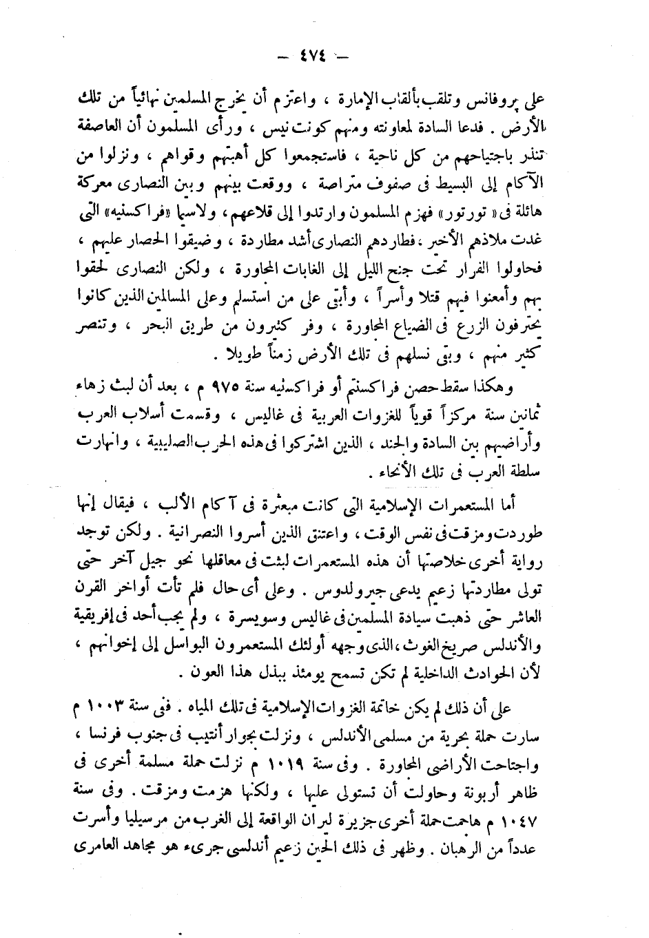 أما المستعمرات الإسلامية التي كانت مبعثرة في آكام الألب، فيقال إنها طوردت ومزقت في نفس الوقت، واعتنق الذين أسروا النصرانية. ولكن توجد رواية أخرى خلاصتها أن هذه المستعمرات لبثت في معاقلها نحو جيل آخر حتى تولى مطاردتها زعيم يدعى جيرولدوس. وعلى أي حال فلم تأت أواخر القرن العاشر حتى ذهبت سيادة المسلمين في غاليس وسويسرة، ولم يجب أحد في إفريقية والأندلس صريخ الغوث، الذي وجهه أولئك المستعمرون البواسل إلى إخوانهم، لأن الحوادث الداخلية لم تكن تسمح يومئذ ببذل هذا العون.