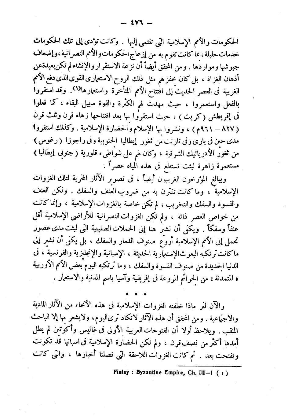 ويبالغ المؤرخون الغربيون أيضاً، في تصوير الآثار المخربة لتلك الغزوات الإسلامية، وما كانت تقترن به من ضروب العنف والسفك. ولكن العنف والقسوة والسفك والتخريب، لم تكن خاصة بالغزوات الإسلامية، وإنما كانت من خواص العصر ذاته، ولم تكن الغزوات النصرانية للأراضي الإسلامية أقل عنفاً وسفكاً. ويكفي أن نشير هنا إلى الحملات الصليبية التي لبثت مدى عصور تحمل إلى الأمم الإسلامية أروع صنوف الدمار والسفك، بل يكفي أن نشير إلى ما كانت ترتكبه البعوث الإستعمارية الحديثة، الإسبانية والإنجليزية والفرنسية، في الدنيا الجديدة من صنوف القسوة والسفك، وما ترتكبه اليوم بعض الأمم الأوربية " المتمدنة " من الجرائم المروعة في إفريقية وآسيا باسم المدنية والاستعمار.