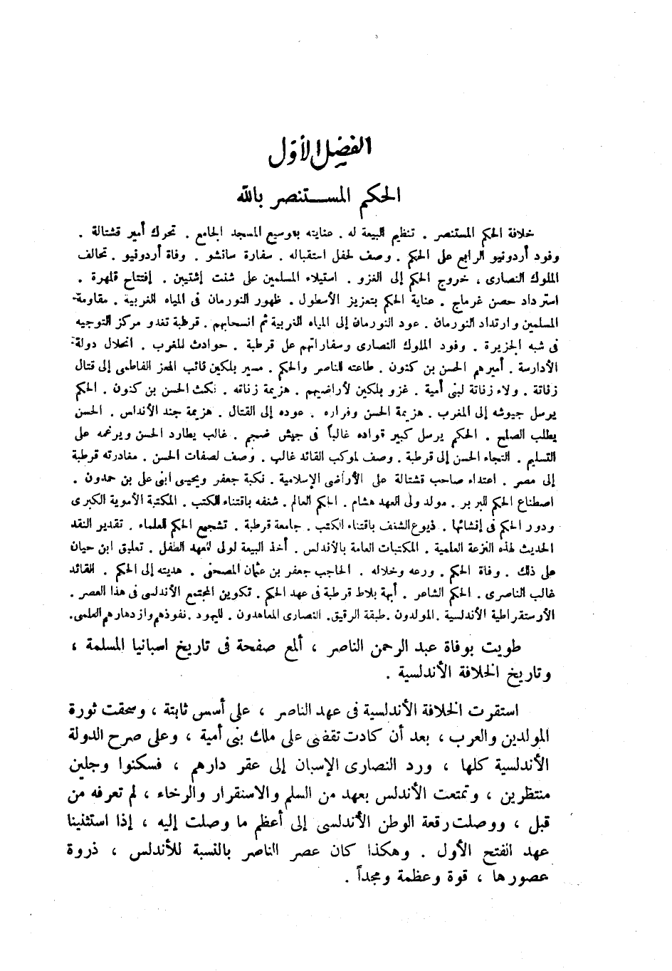 خلافة الحكم المستنصر. تنظيم البيعة له. عنايته بتوسيع المسجد الجامع. تحرك أمير قشتالة. وفود أردونيو الرابع على الحكم. وصف لحفل استقباله. سفارة سانشو. وفاة أردونيو. تحالف الملوك النصارى. خروج الحكم إلى الغزو. استيلاء المسلمين على شنت إشتيبن. إفتتاح قلهرة. استرداد حصن غرماج. عناية الحكم بتعزيز الأسطول. ظهور النورمان في المياه الغربية. مقاومة المسلمين وارتداد النورمان. عود النورمان إلى المياه الغربية ثم انسحابهم. قرطبة تغدو مركز التوجيه في شبه الجزيرة. وفود الملوك النصارى وسفاراتهم على قرطبة. حوادث المغرب. انحلال دولة الأدارسة. أميرهم الحسن بن كنون. طاعته للناصر والحكم. مسير بلكين نائب المعز الفاطمي إلى قتال زناتة. ولاء زناتة لبني أمية. غزو بلكين لأراضيهم. هزيمة زناتة. نكث الحسن بن كنون. الحكم يرسل جيوشه إلى المغرب. هزيمة الحسن وفراره. عوده إلى القتال. هزيمة جند الأندلس. الحسن يطلب الصلح. الحكم يرسل كبير قواده غالباً في جيش ضخم. غالب يطارد الحسن ويرغمه على التسليم. التجاء الحسن إلى قرطبة. وصف لموكب القائد غالب. وصف لصفات الحسن. مغادرته قرطبة إلى مصر. اعتداء صاحب قشتالة على الأراضي الإسلامية. نكبة جعفر ويحيى ابني علي بن حمدون. اصطناع الحكم للبربر. مولد ولي العهد هشام. الحكم العالم. شغفه باقتناء الكتب. المكتبة الأموية الكبرى ودور الحكم في إنشائها. ذيوع الشغف باقتناء الكتب. جامعة قرطبة. تشجيع الحكم للعلماء. تقدير النقد الحديث لهذه النزعة العلمية. المكتبات العامة بالأندلس. أخذ البيعة لولي العهد الطفل. تعليق ابن حيان على ذلك. وفاة الحكم. ورعه وخلاله. الحاجب جعفر بن عثمان المصحفي. هديته إلى الحكم. القائد غالب الناصري. الحكم الشاعر. أبهة بلاط قرطبة في عهد الحكم. تكوين المجتمع الأندلسي في هذا العصر. الأرستقراطية الأندلسية. المولدون. طبقة الرقيق. النصارى المعاهدون. اليهود. نفوذهم وازدهارهم العلمي.