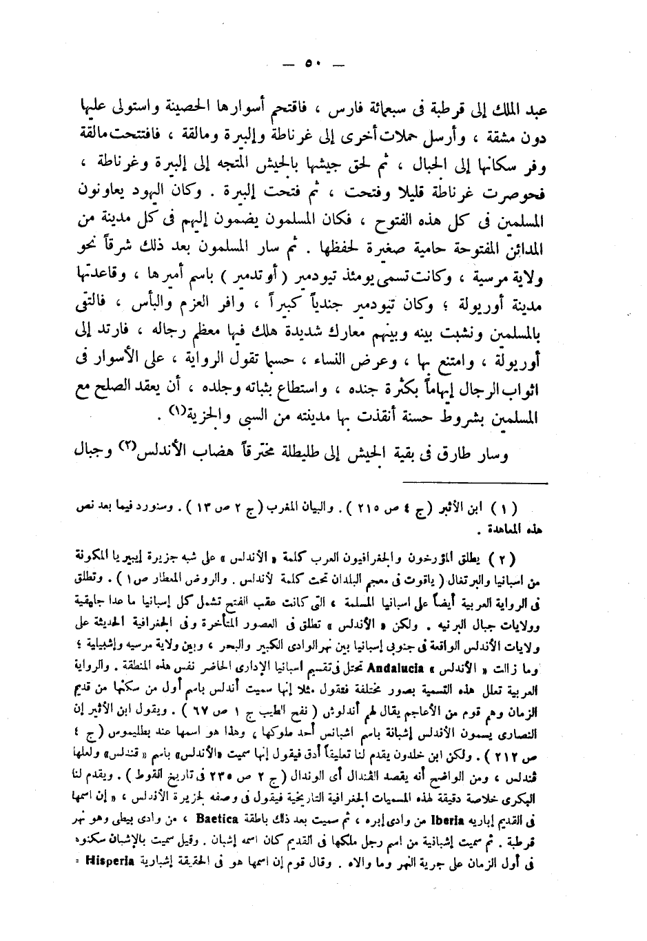 (¬2) يطلق المؤرخون والجغرافيون العرب كلمة " الأندلس " على شبه جزيرة إيبيريا المكونة من اسبانيا والبرتغال (ياقوت في معجم البلدان تحت كلمة الأندلس. والروض المعطار ص 1). وتطلق في الرواية العربية أيضا على اسبانيا المسلمة، التي كانت عقب الفتح تشمل كل إسبانيا ما عدا جليقية وولايات جبال البرنيه. ولكن " الأندلس " تطلق في العصور المتأخرة وفي الجغرافية الحديثة على ولايات الأندلس الواقعة في جنوبي إسبانيا بين نهر الوادي الكبير والبحر، وبين ولاية مرسيه وإشبيلية؛ وما زالت " الأندلس " Andelucia تحتل في تقسيم اسبانيا الإداري الحاضر نفس هذه المنطقة. والرواية العربية تعلل هذه التسمية بصور مختلفة فتقول مثلا إنها سميت أندلس باسم أول من سكنها من قديم الزمان وهم قوم من الأعاجم يقال لهم أندلوش (نفح الطيب ج 1 ص 67). ويقول ابن الأثير إن النصارى يسمون الأندلس إشبانة باسم اشبانس أحد ملوكها، وهذا هو اسمها عند بطليموس (ج 4 ص 212). ولكن ابن خلدون يقدم لنا تعليقا أدق فيقول إنها سميت "الأندلس" باسم "قندلس" ولعلها فندلس، ومن الواضح أنه يقصد الفندال أى الوندال (ج 2 ص 235 في تاريخ القوط). ويقدم لنا البكري خلاصة دقيقة لهذه المسميات الجغرافية التاريخية فيقول في وصفه لجزيرة الأندلس، " إن اسمها في القديم إباريه Iberia من وادي إبره، ثم سميت بعد ذلك باطقة Baetica، من وادي بيطي وهو نهر قرطبة. ثم سميت إشبانية من إسم رجل ملكها في القديم كان اسمه إشبان. وقيل سميت بالإشبان سكنوه في أول الزمان على جرية النهر وما والاه. وقال قوم إن اسمها هو في الحقيقة إشبارية Hisperia =