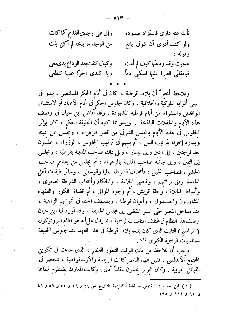 ونلاحظ أخيراً أن بلاط قرطبة، كان في أيام الحكم المستنصر، يبدو في بهي أثوابه الملوكية والخلافية، وكان جلوس الحكم في أيام الأعياد أو لاستقبال الوافدين والسفراء من أيام قرطبة المشهودة. وقد أفاض ابن حيان في وصف هذه الأيام والحفلات الباذخة. ويبدو مما كتبه أن الخليفة الحكم، كان يؤثر الجلوس في هذه الأيام بالمجلس الشرقي من قصر الزهراء، ويجلس عن يمينه ويساره إخوته بترتيب السن؛ ثم يليهم في ترتيب الجلوس، الوزراء، يجلسون بعد فرجتين، إلى اليمين وإلى اليسار، ويلي ذلك صاحب المدينة بقرطبة، ويجلس إلى اليمين، وإلى جانبه صاحب المدينة بالزهراء، ثم يجلس من بعدهم صاحب الحشم، فصاحب الخيل، فأصحاب الشرطة العليا والوسطى، وسائر طبقات أهل الخدمة وفق مراتبهم، وقاضي الجماعة، والحكام وأصحاب الشرطة الصغرى، وأسباط الخلافة، وجلة قريش، ثم وجوه الموالي، ثم قضاة الكور والفقهاء المشاورون والعدول، وأعيان قرطبة. ويصطف الجند في أثوابهم الزاهية، منذ مداخل القصر حتى الممر المفضي إلى مجلس الخليفة، وقد أورد لنا ابن حيان وصف هذا النظام في مختلف المناسبات الرسمية، مما يدل على أنه هو نظام البروتوكول (المراسيم) الثابت الذي كان يتبعه بلاط قرطبة في هذا العهد عند جلوس الخليفة للمناسبات الرسمية الكبرى (¬1).