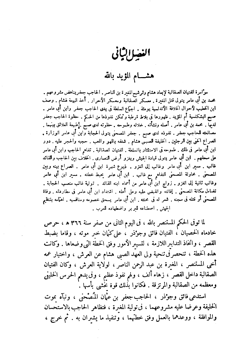 مؤامرة الفتيان الصقالبة لإبعاد هشام وترشيح المغيرة بن الناصر. الحاجب جعفر يناهض مشروعهم. محمد بن أبي عامر يتولى قتل المغيرة. معسكر الصقالبة ومعسكر الأحرار. أخذ البيعة لهشام. وصف ابن الخطيب لأحوال الخلافة الأندلسية يومئذ. اجتماع السلطة في يدي الحاجب جعفر وابن أبي عامر. صبح البشكنسية أم المؤيد. ظهورها في بلاط قرطبة وتمكن نفوذها من الحكم. حظوة الحاجب جعفر لديها. محمد بن أبي عامر. أصله ونشأته. خلاله وطموحه. حظوته لدى صبح. طبيعة العلائق بينهما. مصانعته للحاجب جعفر. نفوذه لدى صبح. جعفر المصحفي يتولى الحجابة وابن أبي عامر الوزارة. الصراع الخفي بين الرجلين. الخليفة الصبي هشام. شغفه باللهو واللعب. حجبه والحجر عليه. دور ابن أبي عامر في ذلك. طموحه في الاستئثار بالسلطة. الفتيان الصقالبة. تفاهم الحاجب وابن أبي عامر على سحقهم. ابن أبي عامر يتولى قيادة الجيش ويغزو أرض النصارى. الخلاف بين الحاجب والقائد غالب. مسير ابن أبي عامر وغالب إلى الغزو. ذيوع شهرة ابن أبي عامر. الصراع بينه وبين المصحفي. محاولة المصحفي التفاهم مع غالب. ابن أبي عامر يحبط خطته. مسير ابن أبي عامر وغالب ثانية إلى الغزو. زواج ابن أبي عامر من أسماء ابنة القائد. تولية غالب منصب الحجابة. تضاءل مكانة المصحفي. إقالته والقبض عليه وعلى أهله. اشتداد ابن أبي عامر في مطاردته. وفاة المصحفي أو قتله في سجنه. شعر له في محنته. ابن أبي عامر يسحق خصومه ومنافسيه. اهتمامه بتنظيم الجيش. اصطناعه للبربر واضطهاده للعرب.