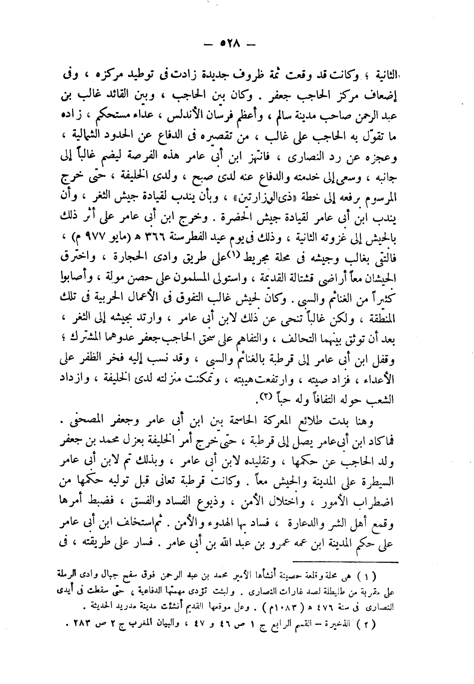 الثانية؛ وكانت قد وقعت ثمة ظروف جديدة زادت في توطيد مركزه، وفي إضعاف مركز الحاجب جعفر. وكان بين الحاجب، وبين القائد غالب بن عبد الرحمن صاحب مدينة سالم، وأعظم فرسان الأندلس، عداء مستحكم، زاده ما تقوّل به الحاجب على غالب، من تقصيره في الدفاع عن الحدود الشمالية، وعجزه عن رد النصارى، فانتهز ابن أبي عامر هذه الفرصة ليضم غالباً إلى جانبه، وسعى إلى خدمته والدفاع عنه لدى صبح، ولدى الخليفة، حتى خرج المرسوم برفعه إلى خطة " ذي الوزارتين "، وبأن يندب لقيادة جيش الثغر، وأن يندب ابن أبي عامر لقيادة جيش الحضرة. وخرج ابن أبي عامر على أثر ذلك بالجيش إلى غزوته الثانية، وذلك في يوم عيد الفطر سنة 366 هـ (مايو 977 م)، فالتقى بغالب وجيشه في محلة مجريط (¬1) على طريق وادي الحجارة، واخترق الجيشان معاً أراضي قشتالة القديمة، واستولى المسلمون على حصن مولة، وأصابوا كثيراً من الغنائم والسبي. وكان لجيش غالب التفوق في الأعمال الحربية في تلك المنطقة، ولكن غالباً تنحى عن ذلك لابن أبي عامر، وارتد بجيشه إلى الثغر، بعد أن توثق بينهما التحالف، والتفاهم على سحق الحاجب جعفر عدوهما المشترك؛ وقفل ابن أبي عامر إلى قرطبة بالغنائم والسبي، وقد نسب إليه فخر الظفر على الأعداء، فزاد صيته، وارتفعت هيبته، وتمكنت منزلته لدى الخليفة، وازداد الشعب حوله التفافاً وله حباً (¬2).