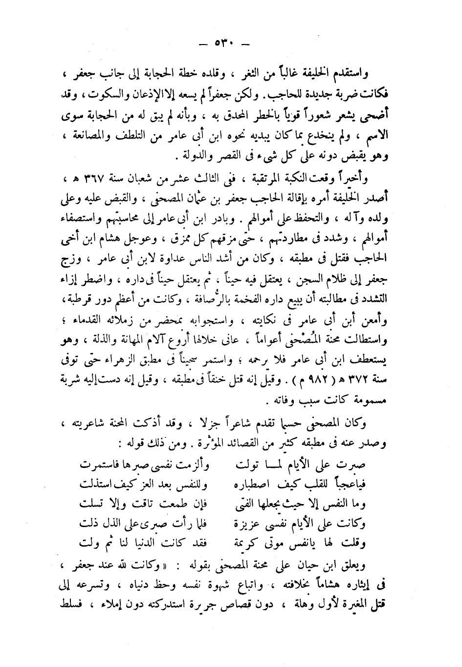 ويعلق ابن حيان على محنة المصحفي بقوله: " وكانت لله عند جعفر، في إيثاره هشاماً بخلافته، واتباع شهوة نفسه وحظ دنياه، وتسرعه إلى قتل المغيرة لأول وهلة، دون قصاص جريرة استدركته دون إملاء، فسلط