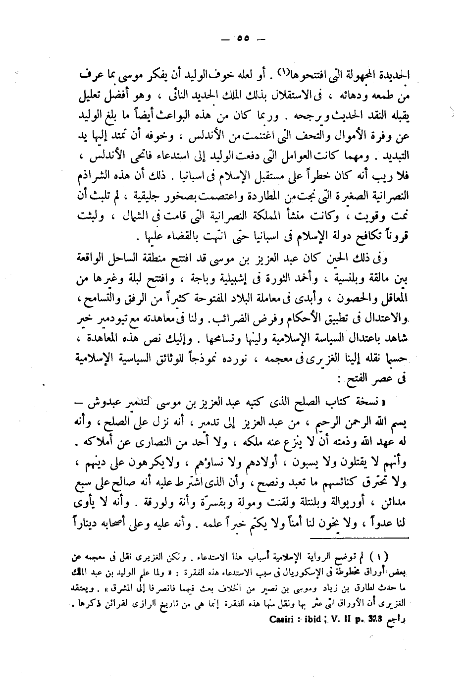 " نسخة كتاب الصلح الذي كتبه عبد العزيز بن موسى لتدمير عبدوش - بسم الله الرحمن الرحيم، من عبد العزيز إلى تدمير، أنه نزل على الصلح، وأنه له عهد الله وذمته أن لا ينزع عنه ملكه، ولا أحد من النصارى عن أملاكه. وأنهم لا يقتلون ولا يسبون، أولادهم ولا نساؤهم، ولا يكرهون على دينهم، ولا تحترق كنائسهم ما تعبد ونصح، وأن الذي اشترط عليه أنه صالح على سبع مدائن، أوريوالة وبلنتلة ولقنت ومولة وبقسرّة وأنة ولورقة. وأنه لا يأوى لنا عدوا، ولا يخون لنا أمناً ولا يكتم خبرا علمه. وأنه عليه وعلى أصحابه دينارا