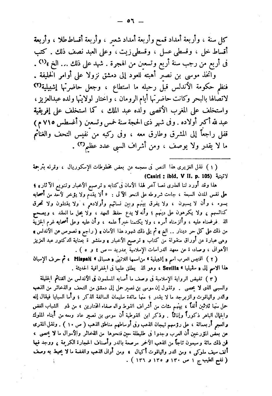 واتخذ موسى بن نصير أهبته للعود إلى دمشق نزولا على أوامر الخليفة. فنظم حكومة الأندلس قبل رحيله ما استطاع، وجعل حاضرتها إشبيلية (¬2) لاتصالها بالبحر وكانت حاضرتها أيام الرومان، واختار لولايتها ولده عبد العزيز، واستخلف على المغرب الأقصى ولده عبد الملك، كا استخلف على إفريقية عبد الله أكبر أولاده. وفي شهر ذي الحجة سنة خمس وتسعين (أغسطس 715 م) قفل راجعاً إلى المشرق وطارق معه، وفي ركبه من نفيس التحف والغنائم ما لا يقدر ولا يوصف، ومن أشراف السبي عدد عظيم (¬3).