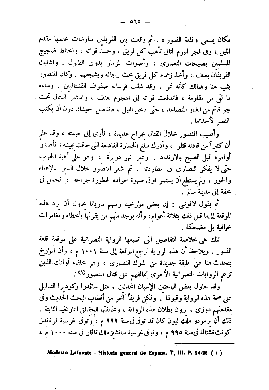 تلك هي خلاصة التفاصيل التي تسبغها الرواية النصرانية على موقعة قلعة النسور. ويلاحظ أن هذه الرواية ترجع الموقعة إلى سنة 1001 م، وأن المؤرخ يتحدث هنا عن طبقة جديدة من الملوك النصارى، وهم خلفاء أولئك الذين تزعم الروايات النصرانية الأخرى تحالفهم على قتال المنصور (¬1).