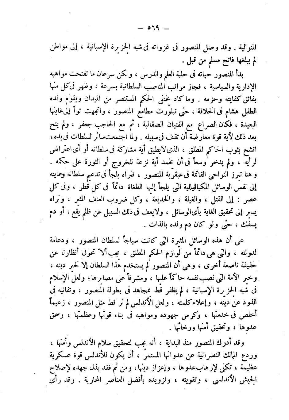 على أن هذه الوسائل المثيرة التي كانت سياجاً لسلطان المنصور، ودعامة لدولته، والتي هي دائماً من لوازم الحكم المطلق، يجب ألا تحول أنظارنا عن حقيقة ناصعة أخرى، وهي أن المنصور لم يستخدم هذا السلطان إلا لخير دينه، وخير الأمة التي نصب نفسه حاكماً عليها، ومشرفاً على مصايرها؛ ولعل الإسلام في شبه الجزيرة الإسبانية، لم يظفر قط بمجاهد في بطولة المنصور، وتفانيه في الذود عن دينه، وإعلاء كلمته، ولعل الأندلس لم تر قط مثل المنصور، زعيماً أخلص في خدمتها، وكرس جهوده ومواهبه في بناء قوتها وعظمتها، وسحق عدوها، وتحقيق أمنها ورخائها.