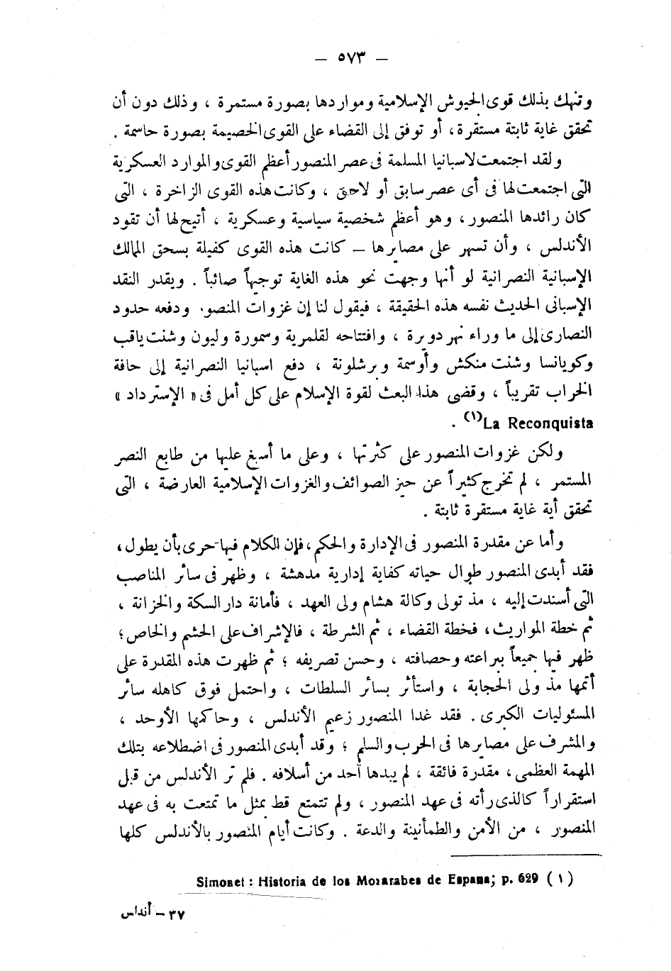 ولقد اجتمعت لاسبانيا المسلمة في عصر المنصور أعظم القوى والموارد العسكرية التي اجتمعت لها في أي عصر سابق أو لاحق، وكانت هذه القوى الزاخرة، التي كان رائدها المنصور، - وهو أعظم شخصية سياسية وعسكرية، أتيح لها أن تقود الأندلس، وأن تسهر على مصايرها - كانت هذه القوى كفيلة بسحق الممالك الإسبانية النصرانية لو أنها وجهت نحو هذه الغاية توجهاً صائباً. ويقدر النقد الإسباني الحديث نفسه هذه الحقيقة، فيقول لنا إن غزوات المنصور ودفعه حدود النصارى إلى ما وراء نهر دويرة، وافتتاحه لقلمرية وسمورة وليون وشنت ياقب وكويانسا وشنت منكش وأوسمة وبرشلونة، دفع اسبانيا النصرانية إلى حافة الخراب تقريباً، وقضى هذا البعث لقوة الإسلام على كل أمل في " الإسترداد " La Reconquista (¬1) .