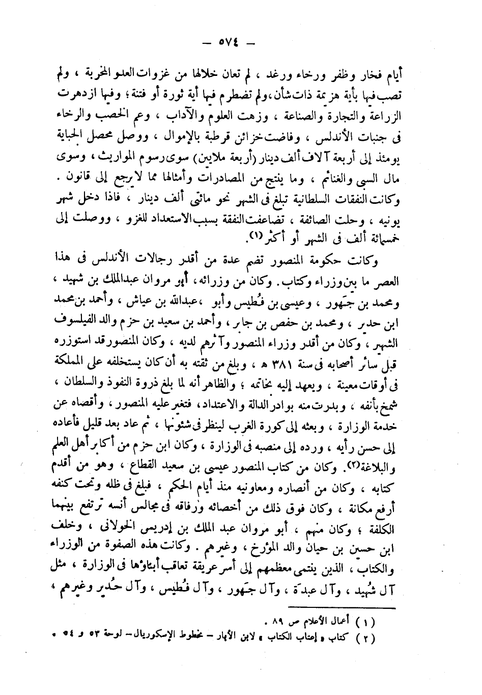وكانت حكومة المنصور تضم عدة من أقدر رجالات الأندلس في هذا العصر ما بين وزراء وكتاب. وكان من وزرائه، أبو مروان عبد الملك بن شهيد، ومحمد بن جَهور، وعيسى بن فُطيس، وأبو عبد الله بن عياش، وأحمد بن محمد ابن حدير، ومحمد بن حفص بن جابر، وأحمد بن سعيد بن حزم والد الفيلسوف الشهير، وكان من أقدر وزراء المنصور وآثرهم لديه، وكان المنصور قد استوزره قبل سائر أصحابه في سنة 381 هـ، وبلغ من ثقته به أن كان يستخلفه على المملكة في أوقات معينة، ويعهد إليه بخاتمه؛ والظاهر أنه لما بلغ ذروة النفوذ والسلطان، شمخ بأنفه، وبدرت منه بوادر الدالة والاعتداد، فتغير عليه المنصور، وأقصاه عن خدمة الوزارة، وبعثه إلى كورة الغرب لينظر في شئونها، ثم عاد بعد قليل فأعاده إلى حسن رأيه، ورده إلى منصبه في الوزارة، وكان ابن حزم من أكابر أهل العلم والبلاغة (¬2). وكان من كتاب المنصور عيسى بن سعيد القطاع، وهو من أقدم كتابه، وكان من أنصاره ومعاونيه منذ أيام الحكم، فبلغ في ظله وتحت كنفه أرفع مكانة، وكان فوق ذلك من أخصائه ورفاقه في مجالس أنسه ترتفع بينهما الكلفة؛ وكان منهم، أبو مروان عبد الملك بن إدريس الخولاني، وخلف ابن حسين بن حيان والد المؤرخ، وغيرهم. وكانت هذه الصفوة من الوزراء والكتاب، الذين ينتمي معظمهم إلى أسر عريقة تعاقب أبناؤها في الوزارة، مثل آل شُهيد، وآل عبدَة، وآل جَهور، وآل فُطيس، وآل حُدير وغيرهم،
