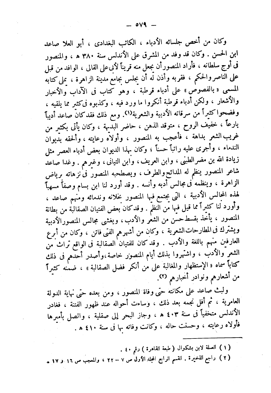 وكان من أخص جلسائه الأدباء، الكاتب البغدادي، أبو العلا صاعد ابن الحسن. وكان قد وفد من المشرق على الأندلس سنة 380 هـ، والمنصور في أوج سلطانه، فأراد المنصور أن يجعل منه قريناً لأبى علي القالي، الوافد من قبل على الناصر والحكم، فقربه وأذن له أن يجلس بجامع مدينة الزاهرة، يملي كتابه المسمى " بالفصوص " على أدباء قرطبة، وهو كتاب في الآداب والأخبار والأشعار، ولكن أدباء قرطبة أنكروا ما ورد فيه، وكذبوه في كثير مما يلقيه، وفضحوا كثيراً من سرقاته الأدبية والشعرية (¬1). ومع ذلك فقد كان صاعد أديباً بارعاً، خفيف الروح، متوقد الذهن، حاضر البديهة، وكان يأتي بكثير من غريب الشعر بداهة، فأعجب به المنصور، وأولاه رعايته، وألحقه بديوان الندماء، وأجرى عليه راتباً حسناً؛ وكان بهذا الديوان بعض أدباء العصر مثل زيادة الله بن مضر الطبني، وابن العريف، وابن التياني، وغيرهم. وغدا صاعد شاعر المنصور ينظم له المدائح والطرف، ويصطحبه المنصور في نزهاته برياض الزاهرة، وينظمه في مجالس أدبه وأنسه. وقد أورد لنا ابن بسام وصفاً مسهباً لهذه المجالس الأدبية، التي يجتمع فيها المنصور بخلانه وندمائه ومنهم صاعد، وأورد لنا كثيراً مما قيل فيها من النظم. وقد كان بعض الفتيان الصقالبة من بطانة المنصور، يأخذ بقسط حسن من الشعر والأدب، ويغشى مجالس المنصورالأدبية ويشترك في المطارحات الشعرية، وكان من أشهرهم الفتى فاتن، وكان من أبرع العارفين منهم باللغة والأدب. وقد كان للفتيان الصقالبة في الواقع تراث من الشعر والأدب، واشتهروا بذلك أيام المنصور خاصة، وأصدر أحدهم في ذلك كتاباً سماه " الإستظهار والمغالبة على من أنكر فضل الصقالبة "، ضمنه كثيراً من أشعارهم ونوادر أخبارهم (¬2).