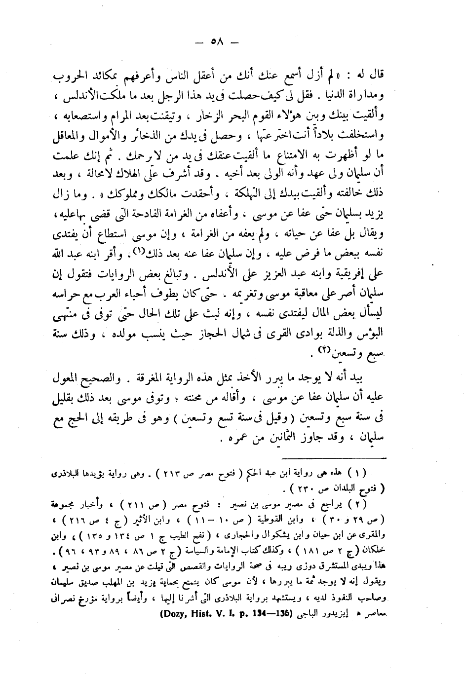 (¬2) يراجع في مصير موسى بن نصير: فتوح مصر (ص 211)، وأخبار مجموعة (ص 29 و30)، وابن القوطية (ص 10 - 11)، وابن الأثير (ج 4 ص 216)، والمقري عن ابن حيان وابن بشكوال والحجارى، (نفح الطيب ج 1 ص 134 و135)، وابن خلكان (ج 2 ص 181)، وكذلك كتاب الإمامة والسياسة (ج 2 ص 86، 89 و93، 96). هذا ويبدي المستشرق دوزي ريبه في صحة الروايات والقصص التي قيلت عن مصير موسى بن نصير، ويقول إنه لا يوجد ثمة ما يبررها، لأن موسى كان يتمتع بحماية يزيد بن المهلب صديق سليمان وصاحب النفوذ لديه، ويستشهد برواية البلاذري إلى أشرنا إليها، وأيضا برواية مؤرخ نصراني معاصر هو إيزيدور الباجي ( Dozy, Hist.V.I.p. 134-135)
