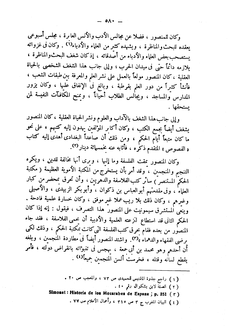وينعى المستشرق سيمونيت على المنصور هذا التصرف، فيقول: " إنه إذا كان الحكم الثاني قد استطاع لنزعته العلمية والأدبية أن يحمي الفلاسفة، فقد جاء المنصور من بعده فقام بحرق كتب الفلسفة التي كانت بمكتبة الحكم، وذلك لكي يرضى الفقهاء والدهماء " (¬3). واشتد المنصور أيضاً في مطاردة المنجمين، وبلغه أن أحدهم وهو محمد بن أبي جمعة، يهجس في تنبؤاته بانقراض دولته، فأمر بقطع لسانه وقتله، فخرست ألسن المنجمين جميعاً (¬4).