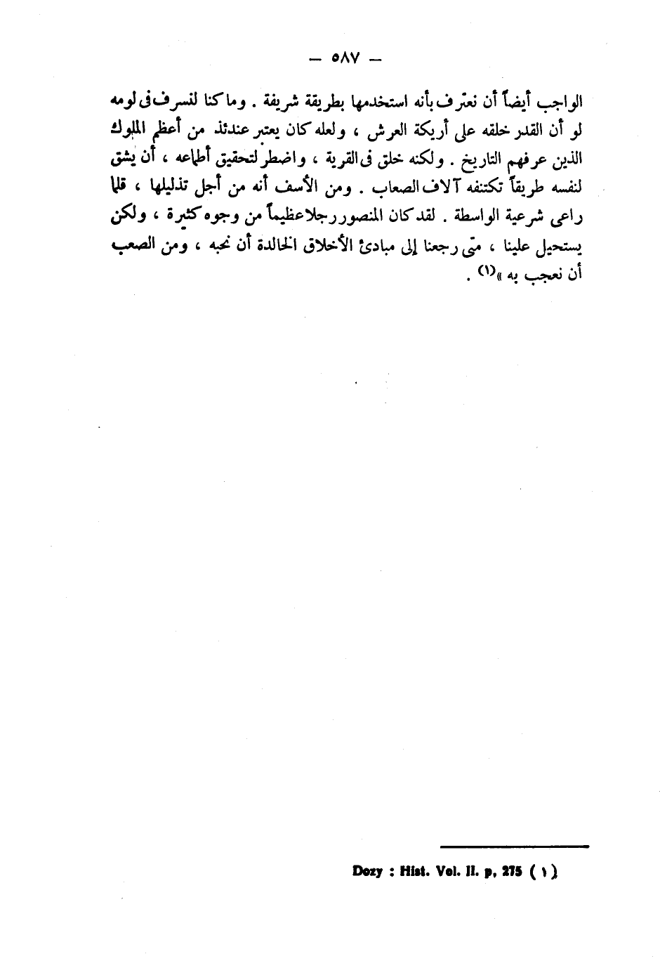الواجب أيضاً أن نعترف بأنه استخدمها بطريقة شريفة. وما كنا لنسرف في لومه لو أن القدر خلقه على أريكة العرش، ولعله كان يعتبر عندئذ من أعظم الملوك الذين عرفهم التاريخ. ولكنه خلق في القرية، واضطر لتحقيق أطماعه، أن يشق لنفسه طريقاً تكتنفه آلاف الصعاب. ومن الأسف أنه من أجل تذليلها، قلما راعى شرعية الواسطة. لقد كان المنصور رجلا عظيماً من وجوه كثيرة، ولكن يستحيل علينا، متى رجعنا إلى مبادىء الأخلاق الخالدة أن نحبه، ومن الصعب أن نعجب به " (¬1).