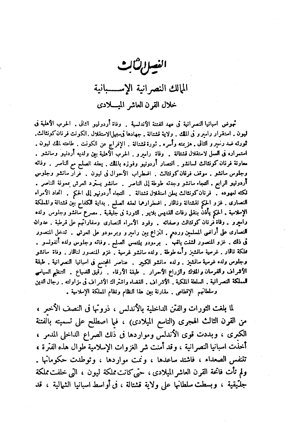 نهوض اسبانيا النصرانية في عهد الفتنة الأندلسية. وفاة أردونيو الثاني. الحرب الأهلية في ليون. استقرار راميرو في الملك. ولاية قشتالة. جهادها في سبيل الاستقلال. الكونت فرنان كونثالث. ثورته ضد راميرو الثاني. هزيمته وأسره. ثورة قشتالة. الإفراج عن الكونت. طاعته لملك ليون. استمراره في العمل لاستقلال قشتالة. وفاة راميرو. الحرب الأهلية بين ولديه أردونيو وسانشو. معاونة فرنان كونثالث لسانشو. انتصار أردونيو وفوزه بالملك. يعقد الصلح مع الناصر. وفاته وجلوس سانشو. موقف فرنان كونثالث. اضطراب الأحوال في ليون. فرار سانشو وجلوس أردونيو الرابع. التجاء سانشو وجدته طوطة إلى الناصر. سانشو يسترد العرش بمعونة الناصر. نكثه لعهوده. فرنان كونثالث يعلن استقلال قشتالة. التجاء أردونيو إلى الحكم. اتحاد الأمراء النصارى. غزو الحكم لقشتالة ونافار. اضطرارهما لعقد الصلح. بداية الكفاح بين قشتالة والمملكة الإسلامية. الحكم يأذن بنقل رفات القديس بلايو. الثورة في جليقية. مصرع سانشو وجلوس ولده راميرو. وفاة فرنان كونثالث وصفاته. وفود الأمراء النصارى وسفاراتهم على قرطبة. عدوان النصارى على أراضي المسلمين وردهم. النزاع بين راميرو وبرمودو على العرش. تدخل المنصور في ذلك. غزو المنصور لشنت ياقب. برمودو يلتمس الصلح. وفاته وجلوس ولده ألفونسو. ملكة نافار. غرسية سانشيز وأمه طوطة. ولده سانشو غرسية. غزو المنصور لنافار. وفاة سانشو وجلوس ولده غرسية سانشيز. ولده سانشو الكبير. عناصر المجتمع في اسبانيا النصرانية. طبقة الأشراف والفرسان والملاك والزراع الأحرار. طبقة الأرقاء. رقيق الضياع. التنظيم السياسي للمملكة النصرانية. السلطة المركزية. الأشراف. القضاء واشتراك الأشراف في مزاولته. رجال الدين وسلطانهم الإقطاعي. مقارنة بين هذا النظام ونظام المملكة الإسلامية.
