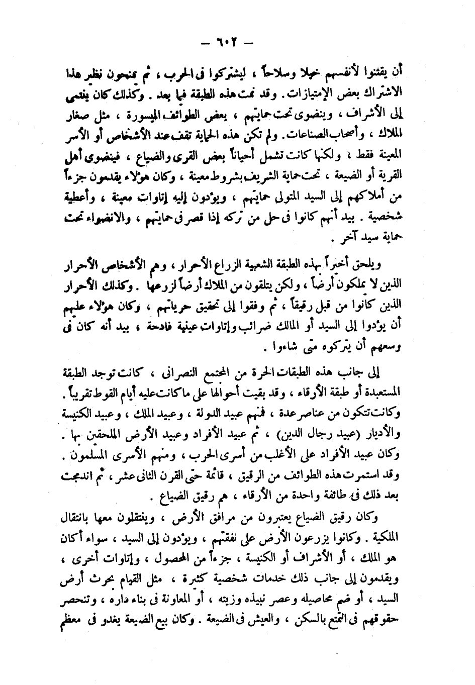 أن يقتنوا لأنفسهم خيلا وسلاحاً، ليشتركوا في الحرب، ثم يمنحون نظير هذا الاشتراك بعض الإمتيازات. وقد نمت هذه الطبقة فيما بعد. وكذلك كان ينتمي إلى الأشراف، وينضوي تحت حمايتهم، بعض الطوائف الميسورة، مثل صغار الملاك، وأصحاب الصناعات. ولم تكن هذه الحماية تقف عند الأشخاص أو الأسر المعينة فقط، ولكنها كانت تشمل أحياناً بعض القرى والضياع، فينضوي أهل القرية أو الضيعة، تحت حماية الشريف بشروط معينة، وكان هؤلاء يقدمون جزءاً من أملاكهم إلى السيد المتولي حمايتهم، ويؤدون إليه إتاوات معينة، وأعطية ْشخصية. بيد أنهم كانوا في حل من تركه إذا قصر في حمايتهم، والانضواء تحت حماية سيد آخر.