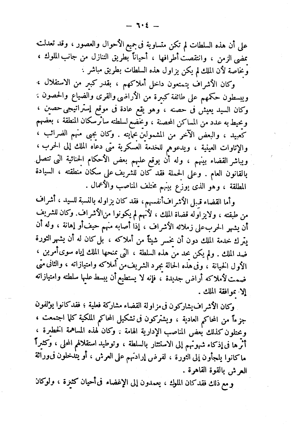 وكان الأشراف يتمتعون داخل أملاكهم، بقدر كبير من الاستقلال، ويبسطون حكمهم على طائفة كبيرة من الأراضي والقرى والضياع والحصون، وكان السيد يعيش في حصنه، وهو يقع عادة في موقع إستراتيجي حصين، ويحيط به عدد من المساكن المحصنة، ويخضع لسلطته سائر سكان المنطقة، بعضهم كعبيد، والبعض الآخر من المشمولين بحمايته. وكان يجني منهم الضرائب، والإتاوات العينية، ويدعوهم للخدمة العسكرية متى دعاه الملك إلى الحرب، ويباشر القضاء بينهم، وله أن يوقع عليهم بعض الأحكام الجنائية التي تتصل بالقانون العام. وعلى الجملة فقد كان للشريف على سكان منطقته، السيادة المطلقة، وهو الذي يوزع بينهم مختلف المناصب والأعمال.