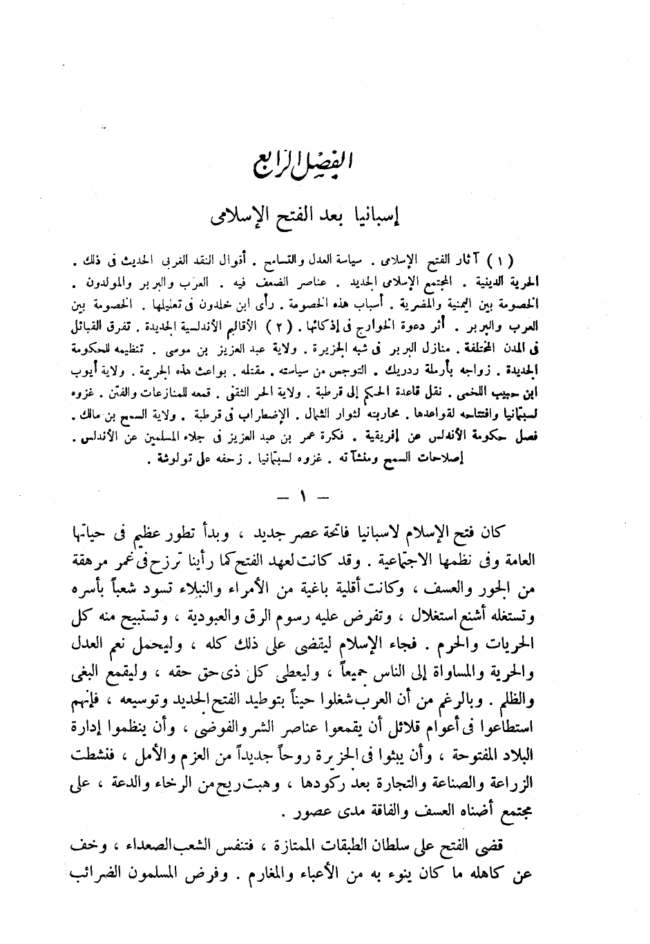 (1) آثار الفتح الإسلامي. سياسة العدل والتسامح. أقوال النقد الغربي الحديث في ذلك. الحرية الدينية. المجتمع الإسلامي الجديد. عناصر الضعف فيه. العرب والبربر والمولدون. الخصومة بين اليمنية والمضرية. أسباب هذه الخصومة. رأى ابن خلدون في تعليلها. الخصومة بين العرب والبربر. أثر دعوة الخوارج في إذكائها. (2) الأقاليم الأندلسية الجديدة. تفرق القبائل في المدن المختلفة. منازل البربر في شبه الجزيرة. ولاية عبد العزيز بن موسى. تنظيمه للحكومة الجديدة. زواجه بأرملة ردريك. التوجس من سياسته. مقتله. بواعث هذه الجريمة. ولاية أيوب ابن حبيب اللخمي. نقل قاعدة الحكم إلى قرطبة. ولاية الحر الثقفي. قمعه للمنازعات والفتن. غزوه لسبتمانيا وافتتاحه لقواعدها. محاربته لثوار الشمال. الإضطراب في قرطبة. ولاية السمح بن مالك. فصل حكومة الأندلس عن إفريقية. فكرة عمر بن عبد العزيز في جلاء المسلمين عن الأندلس. إصلاحات السمح ومنشآته. غزوه لسبتمانيا. زحفه على تولوشة.