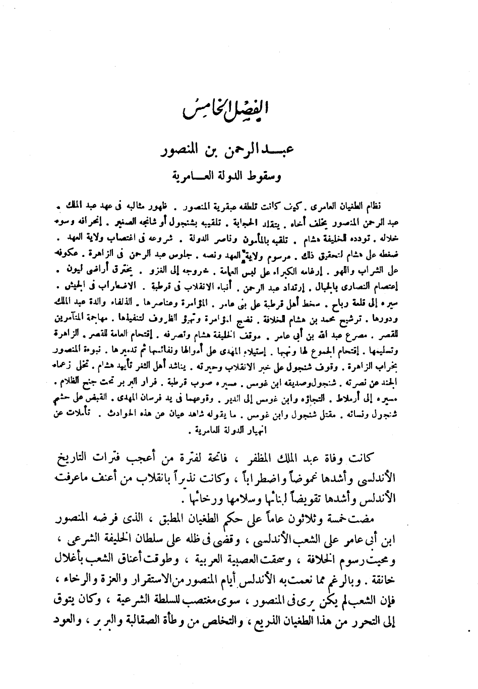 نظام الطغيان العامري. كيف كانت تلطفه عبقرية المنصور. ظهور مثالبه في عهد عبد الملك. عبد الرحمن المنصور يخلف أخاه. يتقلد الحجابة. تلقيبه بشنجول أو شانجه الصغير. إنحرافه وسوء خلاله. تودده للخليفة هشام. تلقبه بالمأمون وناصر الدولة. شروعه في اغتصاب ولاية العهد. ضغطه على هشام لتحقيق ذلك. مرسوم ولاية العهد ونصه. جلوس عبد الرحمن في الزاهرة. عكوفه على الشراب واللهو. إرغامه الكبراء على لبس العمامة. خروجه إلى الغزو. يخترق أراضي ليون. إعتصام النصارى بالجبال. ارتداد عبد الرحمن. أنباء الإنقلاب في قرطبة. الاضطراب في الجيش. سيره إلى قلعة رباح. سخط أهل قرطبة على بني عامر. المؤامرة وعناصرها. الذلفاء والدة عبد الملك ودورها. ترشيح محمد بن هشام للخلافة. نضج المؤامرة وتهيؤ الظروف لتنفيذها. مهاجمة المتآمرين للقصر. مصرع عبد الله بن أبي عامر. موقف الخليفة هشام وتصرفه. إقتحام العامة للقصر. الزاهرة وتسليمها. إقتحام الجموع لها ونهبها. إستيلاء المهدي على أموالها ونفائسها ثم تدميرها. نبوءة المنصور بخراب الزاهرة. وقوف شنجول على خبر الانقلاب وحيرته. يناشد أهل الثغر تأييد هشام. تخلي زعماء الجند عن نصرته. شنجول وصديقه ابن غومس. مسيره صوب قرطبة. فرار البربر تحت جنح الظلام. مسيره إلى أرملاط. التجاؤه وابن غومس إلى الدير. وقوعهما في يد فرسان المهدي. القبض على حشم شنجول ونسائه. مقتل شنجول وابن غومس. ما يقوله شاهد عيان عن هذه الحوادث. تأملات عن انهيار الدولة العامرية.